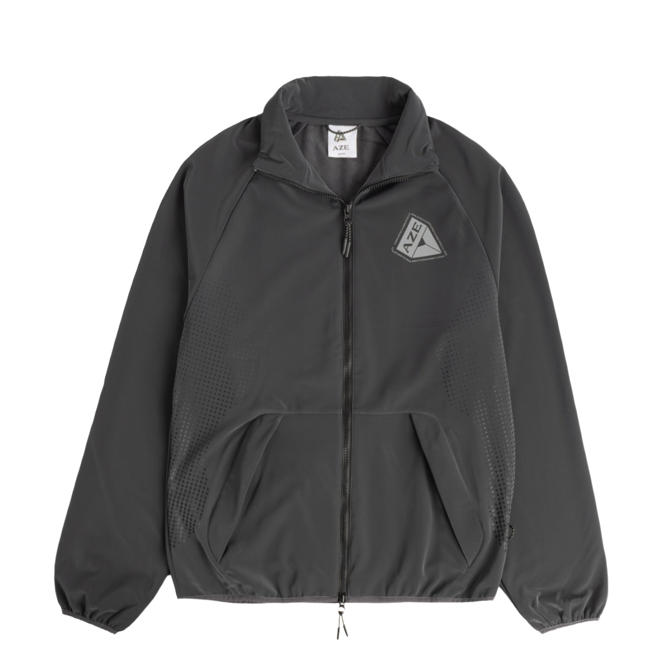 The A Zero Effect Track Top in Grey is designed in a relaxed fit for easy layering and everyday comfort. Made with the brand’s signature AZE track fabric featuring a subtle silicone dot print, it combines practicality with a refined finish. The elasticated cuffs and hem help retain warmth and shape, making it versatile for both casual wear and active use.