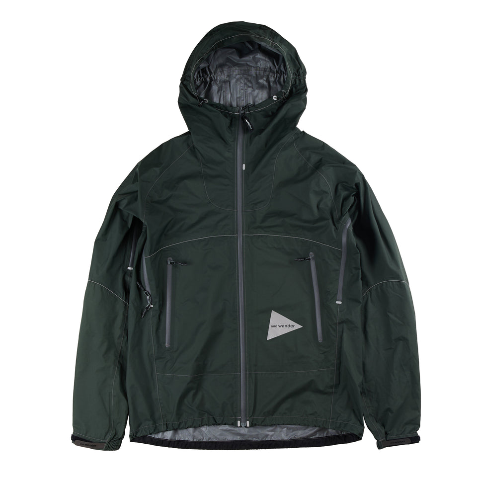 The And Wander 3L UL Rain Jacket in Green is an ultra-lightweight, high-performance outer layer designed for unpredictable conditions. Made from durable Pertex® Shield nylon ripstop fabric with a PU coating, it offers reliable protection against rain and snow. Armpit ventilation ensures breathability during active use, while partial reflective stitching enhances visibility at night. Finished with minimal zip closures, adjustable bungee drawstrings at the collar and hem, and a self-storing nylon carry bag, this jacket blends functionality with a refined, technical aesthetic.