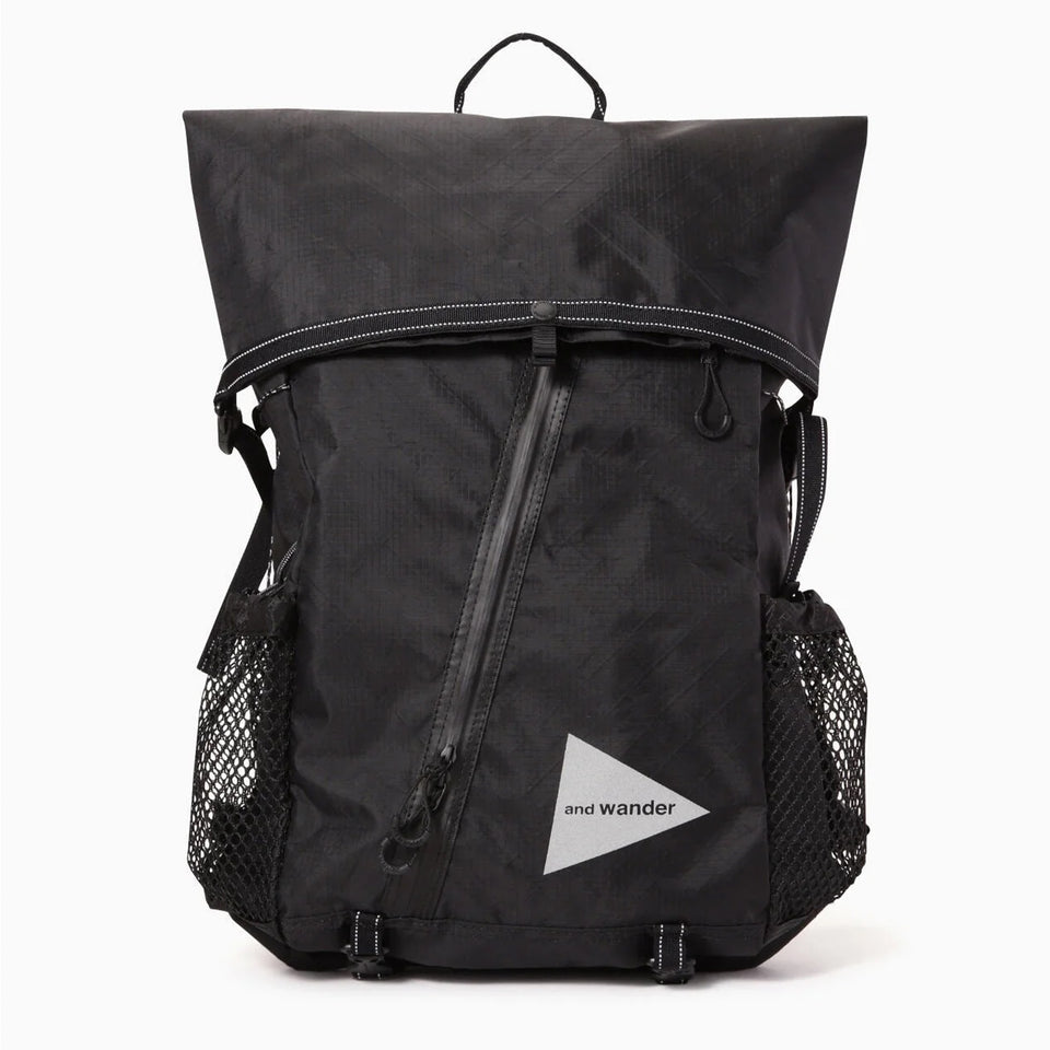 The And Wander Ecopak 18L Backpack in Black is made from durable Ecopak Cordura nylon, a water-resistant, lightweight material designed for both daily use and outdoor versatility.