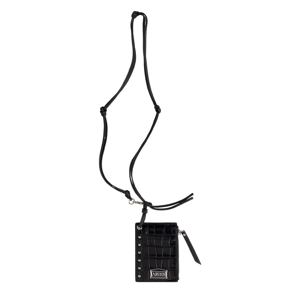 The Aries Croc Card Holder in Black features studs, an Aries metal logo plaque, and a leather strap. Crafted in Italy.