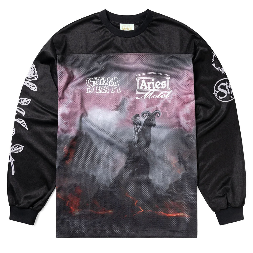 The Aries Ramscape Airtex LS Tee in Black is a relaxed, long sleeve football jersey featuring a RAMSCAPE print on airtex mesh combined with solid black panels and unique graphic screen prints. Crafted in Portugal.