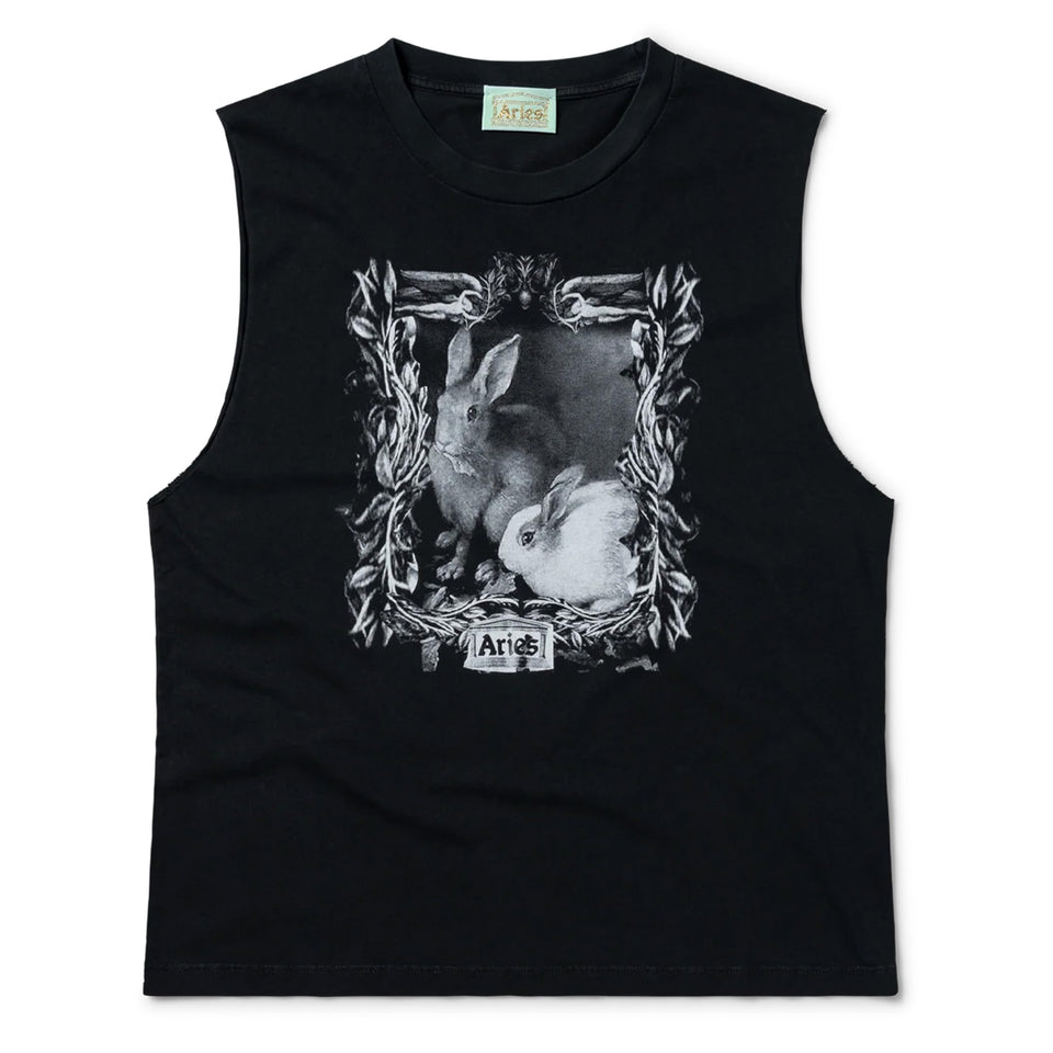 The Aries Faded Bunny Muscle Vest in Black is a unisex sleeveless top featuring a bold Bunny graphic screen-printed on the front. Treated with a stone wash for a worn-in, vintage effect, this Italian-made vest offers a relaxed fit and edgy style. Perfect for layering or wearing solo, it brings a faded, streetwear-inspired look to everyday outfits.