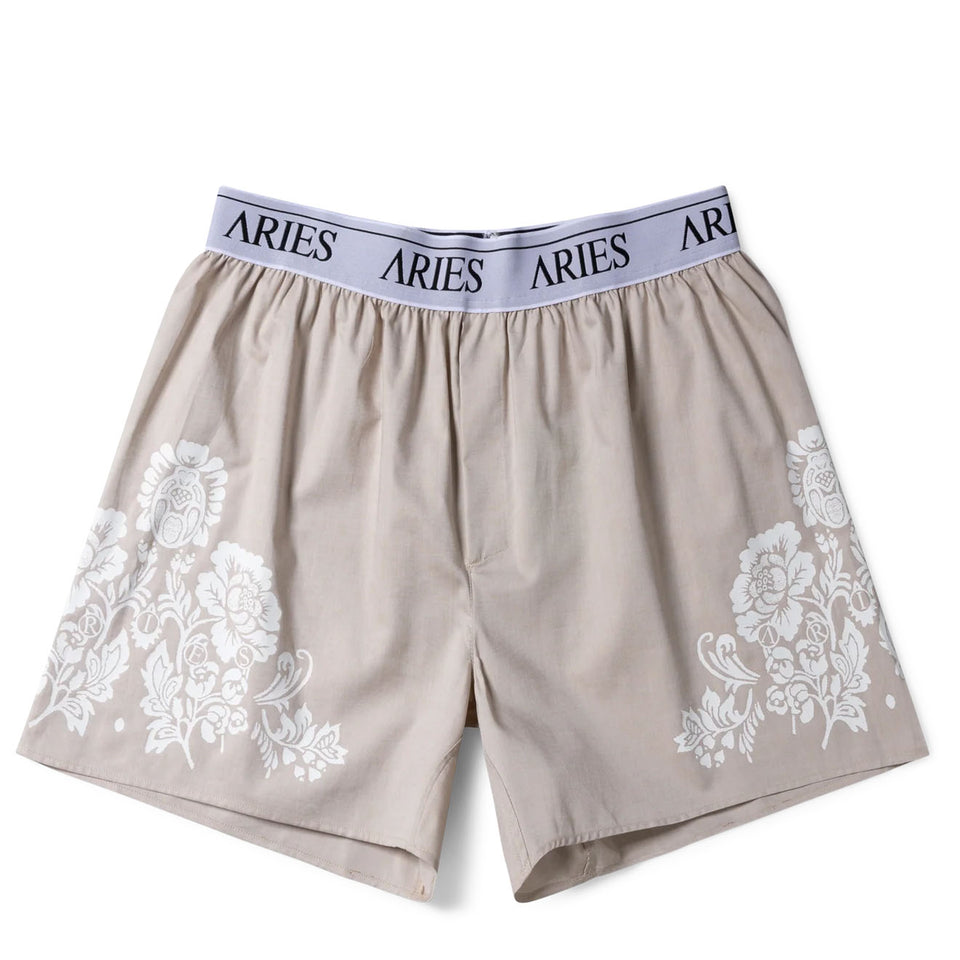The Aries Womens Brown Lace Print Boxer Shorts are a timeless pair of Oxford striped boxer shorts featuring the iconic Aries logo elastic waistband. Crafted from washed Oxford cotton, these shorts also showcase a screen-printed Lace graphic on both sides.