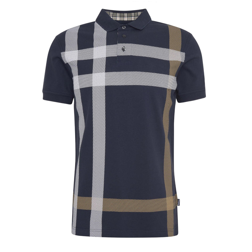 The Barbour Blaine Polo Shirt in Navy and Pine features a bold oversized tartan pattern across the body, making it a standout piece for warmer months. Styled with a two button placket and ribbed collar and cuffs, it is finished with Barbour tartan trim on the inner collar and placket for a signature touch. This polo combines classic detailing with a fresh design, perfect for smart casual looks.