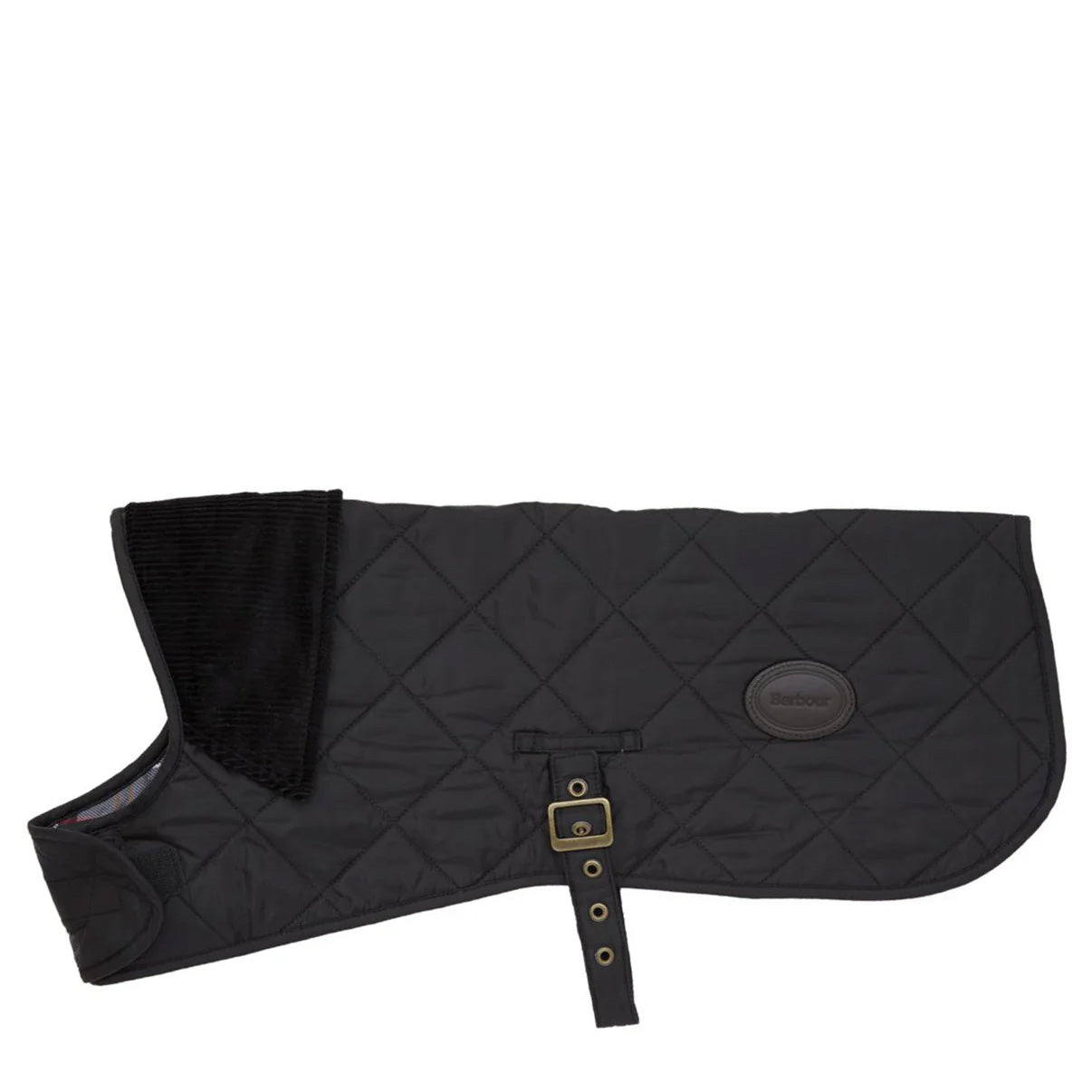 The Barbour Quilted Dog Coat in Black combines comfort and style with its diamond-quilted nylon outer layer. It features an adjustable waist strap with an aged brass buckle and eyelets, and a velcro-fastening neck for a snug fit. The coat is adorned with a Barbour leather logo badge and lined with Ancient Tartan. The fold-back corduroy collar adds an extra layer of protection against the elements, making it perfect for unpredictable weather.