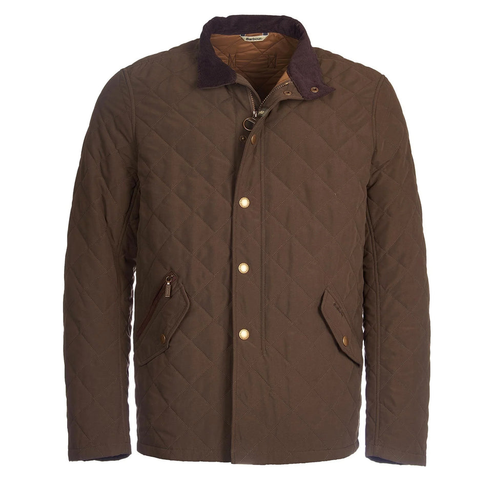 The Barbour Shoveler Quilted Jacket in Dark Olive showcases a studded front closure and practical lower flap pockets for convenient storage. A secure zipped pocket provides added safety for valuables, while the contrasting coloured lining lends a timeless touch of style. Thoughtfully designed with adjustable tabs at the back of the neck and a needlecord inner collar, this jacket is finished with Barbour branding on the left pocket flap for an elegant signature detail.