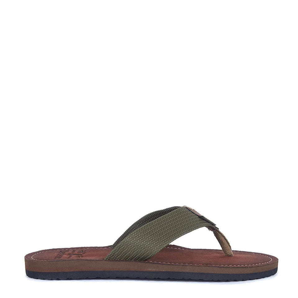 The Barbour Toeman Beach Sandal in Olive is a summer-ready toe-post sandal built for all-day comfort and easy wear. It features wide woven nylon straps for a secure fit, dual-density foam soles for cushioned support, and a microfibre-lined footbed that offers a soft, suede-like feel. A textured outsole ensures grip, while the woven Barbour label adds a signature touch. Ideal for the beach, poolside, or everyday casual outings.