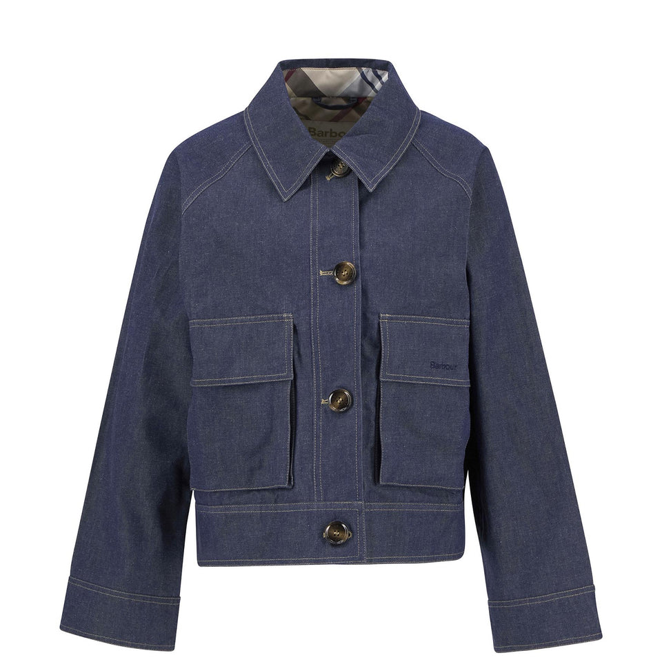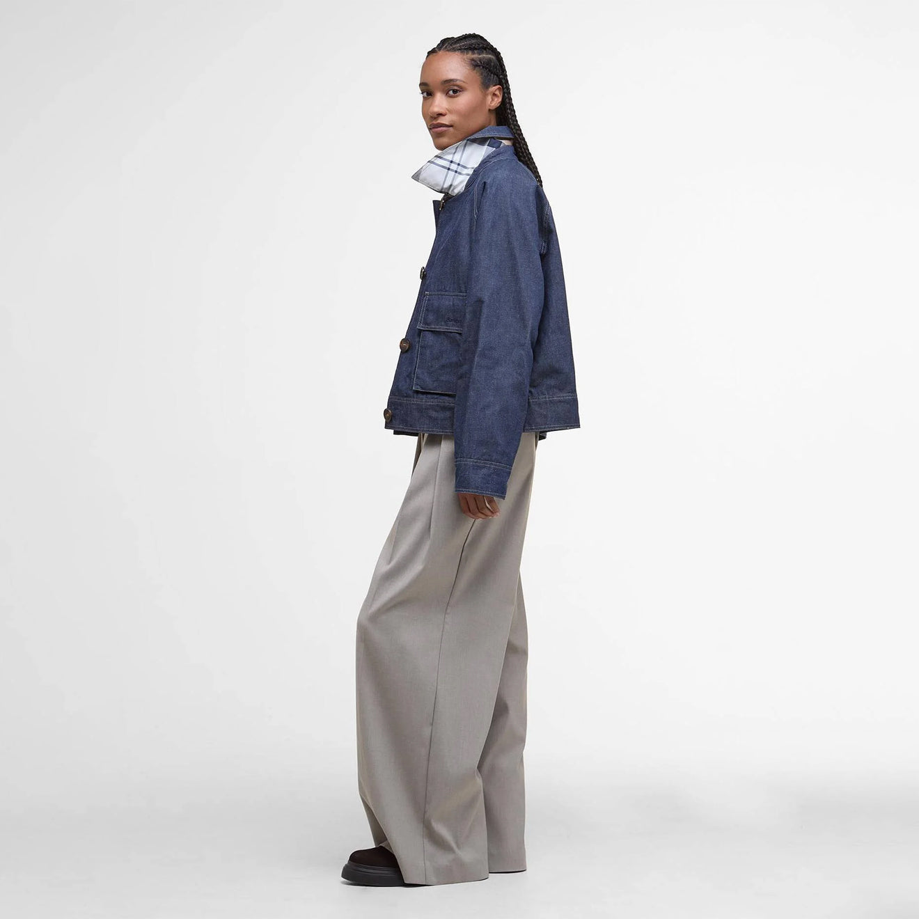 The Barbour Womens Demi Showerproof Jacket in Indigo/Hessian Tartan updates the classic denim jacket for cooler, wetter days. The hybrid aero denim fabric gives it a structured feel while remaining lightweight enough for layering. With its tartan interior, buttoned front and spacious bellow pockets, it balances practicality and a clean, contemporary look.
