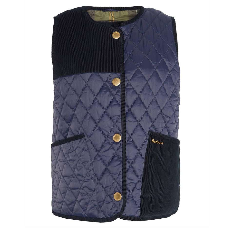 The Barbour Women's Healy Liner in Navy/Classic features a diamond-quilted design with cord patchwork detailing. Finished with patch pockets, this versatile piece is perfect for layering over T-shirts or under a jacket, offering timeless style and practicality.