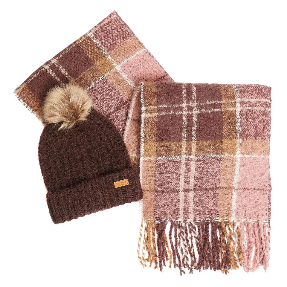 Barbour Womens Saltburn Beanie + Tartan Scarf Gift Set Chocolate