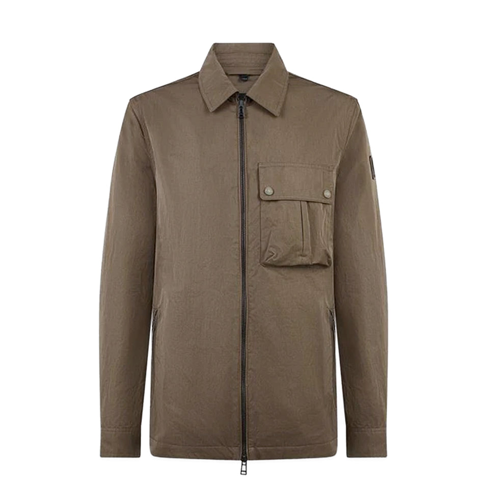 The Belstaff Drome Overshirt in Major Brown is a functional and refined outer layer crafted from a cotton nylon gabardine blend, offering both softness and durability. Designed with a water-repellent finish for protection in unpredictable weather, it features a centre front zip, adjustable press stud cuffs, and multiple utility pockets for added practicality.