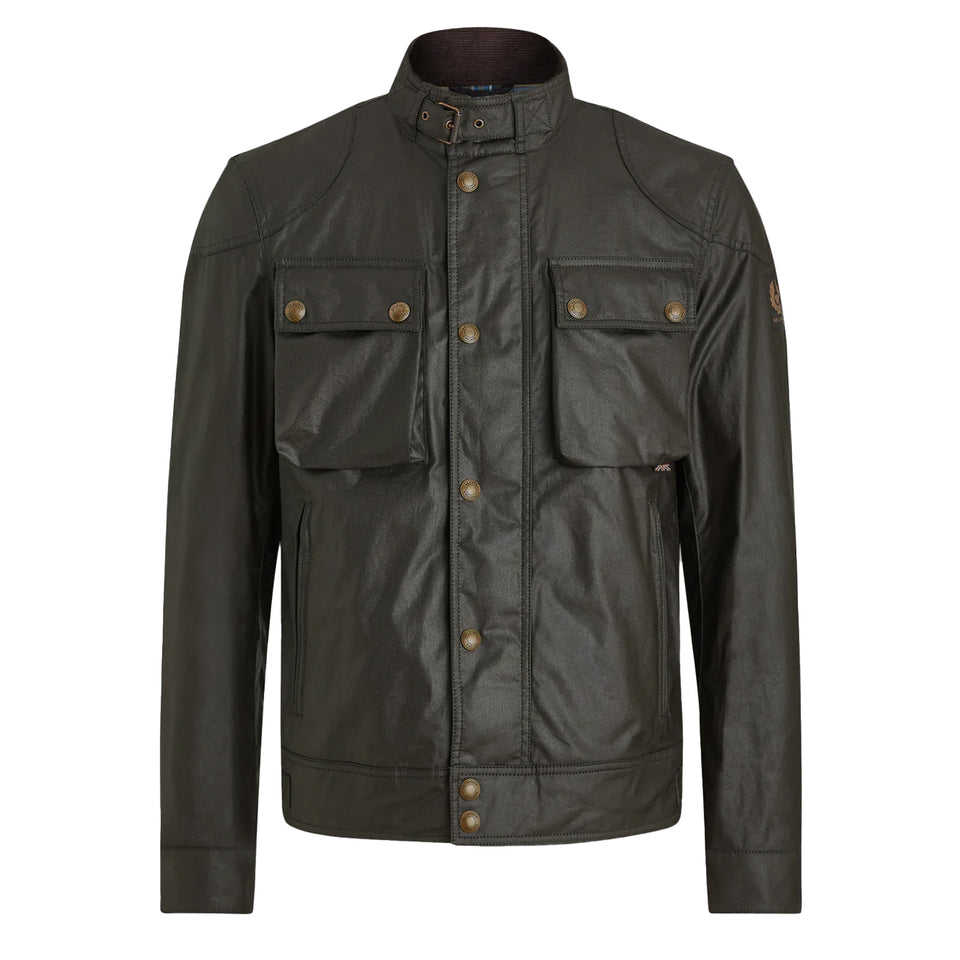 Antique brass metal hardware with Belstaff engraving and woven Phoenix patch on left sleeve