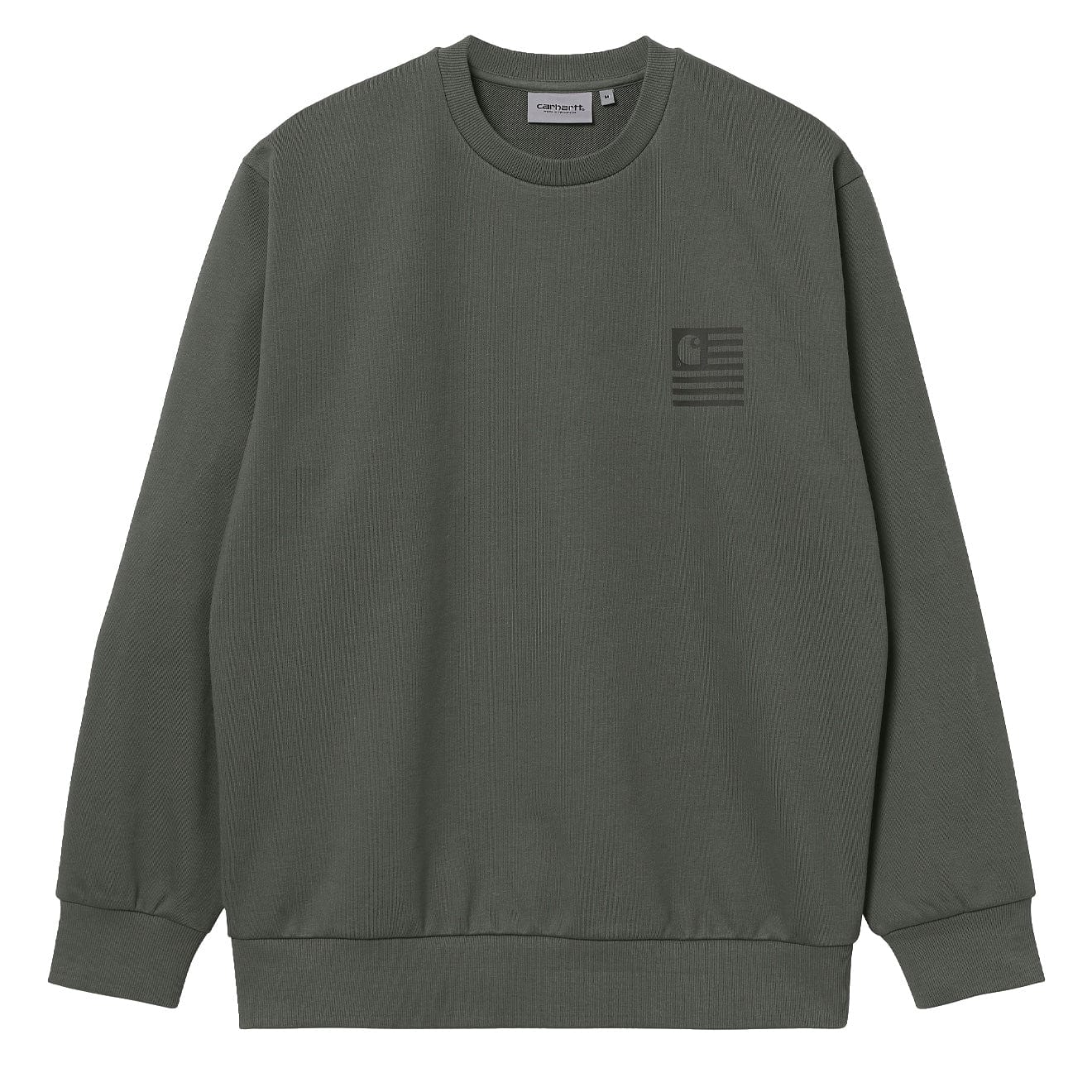 The Carhartt Medley State Sweatshirt is constructed from a heavyweight unbrushed cotton-poly blend. Finished with a seasonal puff print graphic based on Carhartt's classic state flag motif.