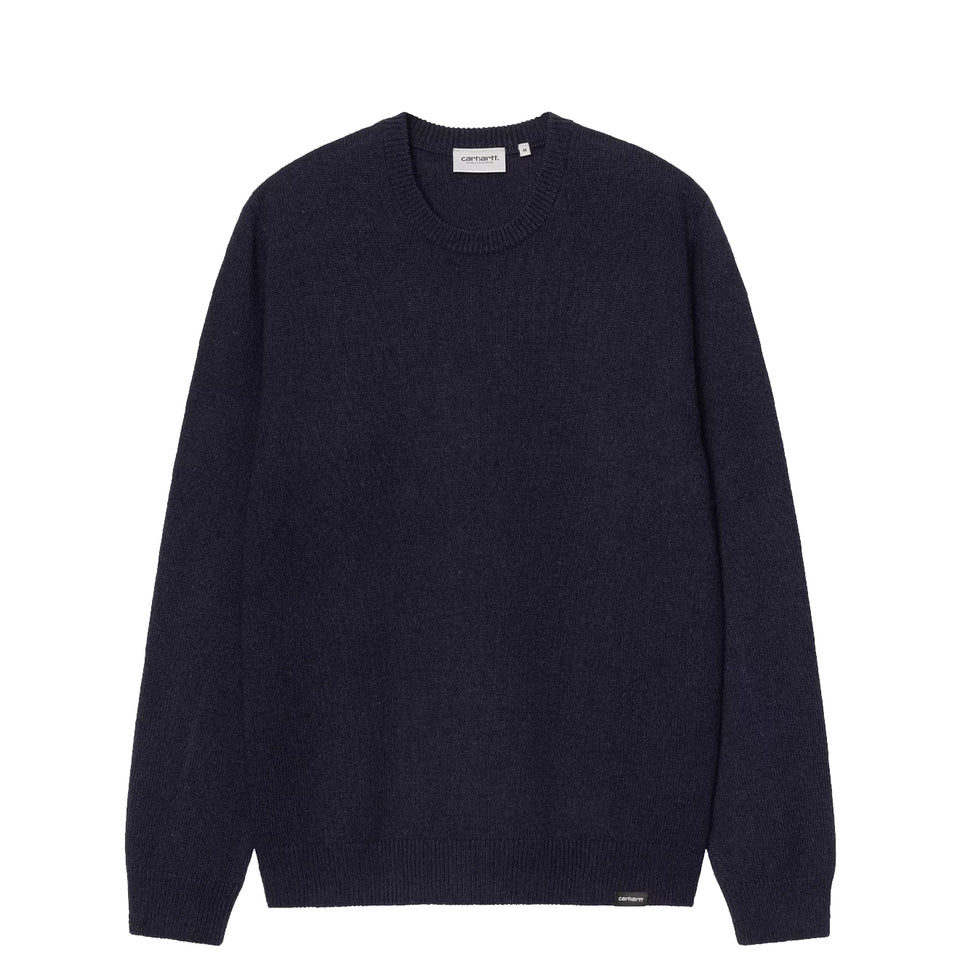 The Carhartt WIP Alten Sweater in Deep Night offers both warmth and comfort. A woven Script label on the bottom band adds a refined finishing touch to the design. Crafted from a blend of wool fibres.