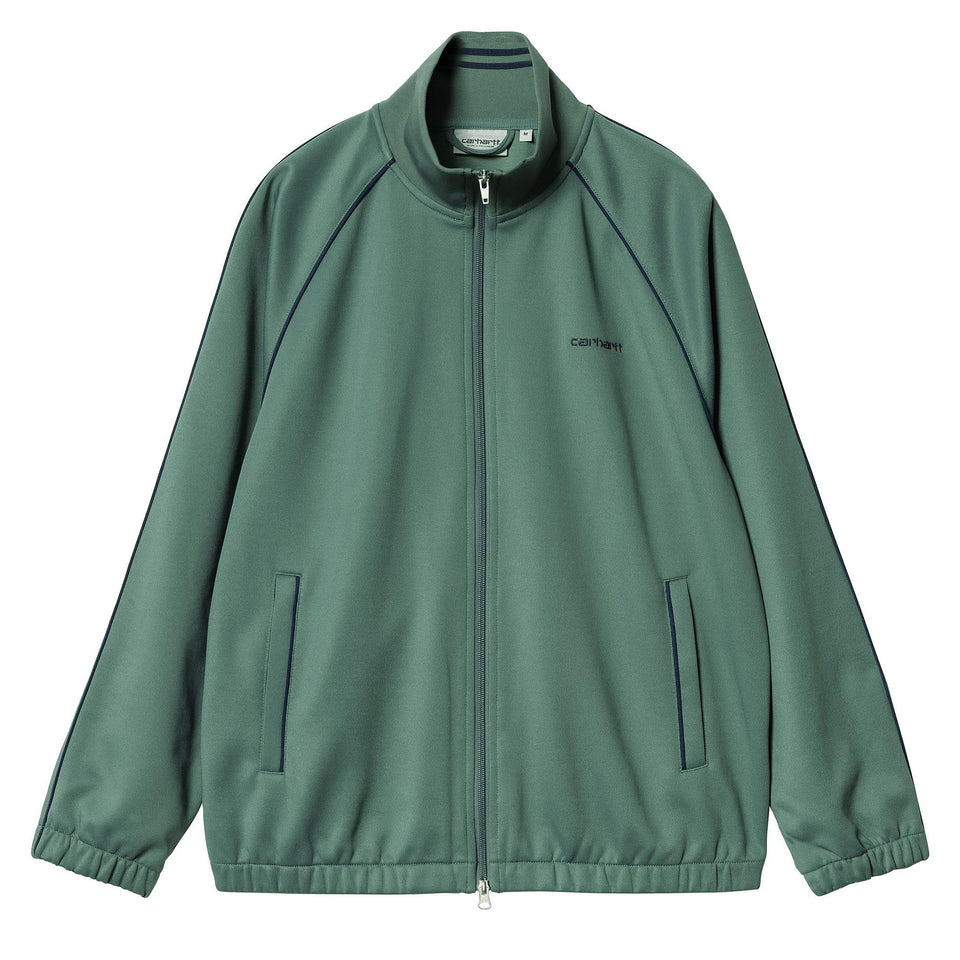 The Carhartt WIP Benford Jacket in Silver Pine/Ink is a tracksuit-inspired piece made from unbrushed polycotton fabric in a loose fit. Featuring a high neck, elasticated bottom band, and cuffs, it offers a comfortable and stylish fit. The raglan sleeves are detailed with contrast piping for added flair, while an embroidered Script Logo on the chest completes the design. Perfect for a relaxed, sporty look, this jacket combines functionality with modern street style.