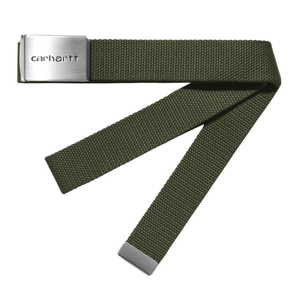 The Clip Belt Chrome is constructed from robust polyester canvas and features a fully adjustable, interchangeable chrome metal clip buckle with debossed Carhartt WIP branding.