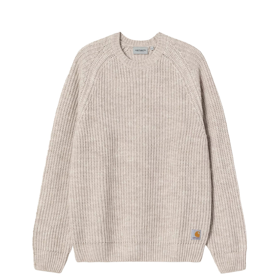 The Carhartt WIP Firth Sweater in Fleur De Sel is knit from a combination of natural and synthetic yarns, offering both durability and comfort. It features raglan sleeves and a woven Square Label at the hem for a subtle finishing touch.