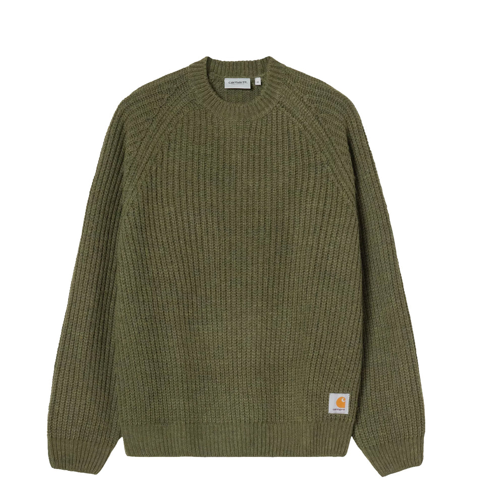 The Carhartt WIP Firth Sweater in Opuntia is knit from a mix of natural and synthetic yarns, offering both comfort and durability. It features raglan sleeves and a woven Square Label at the hem, adding a refined touch to its design.