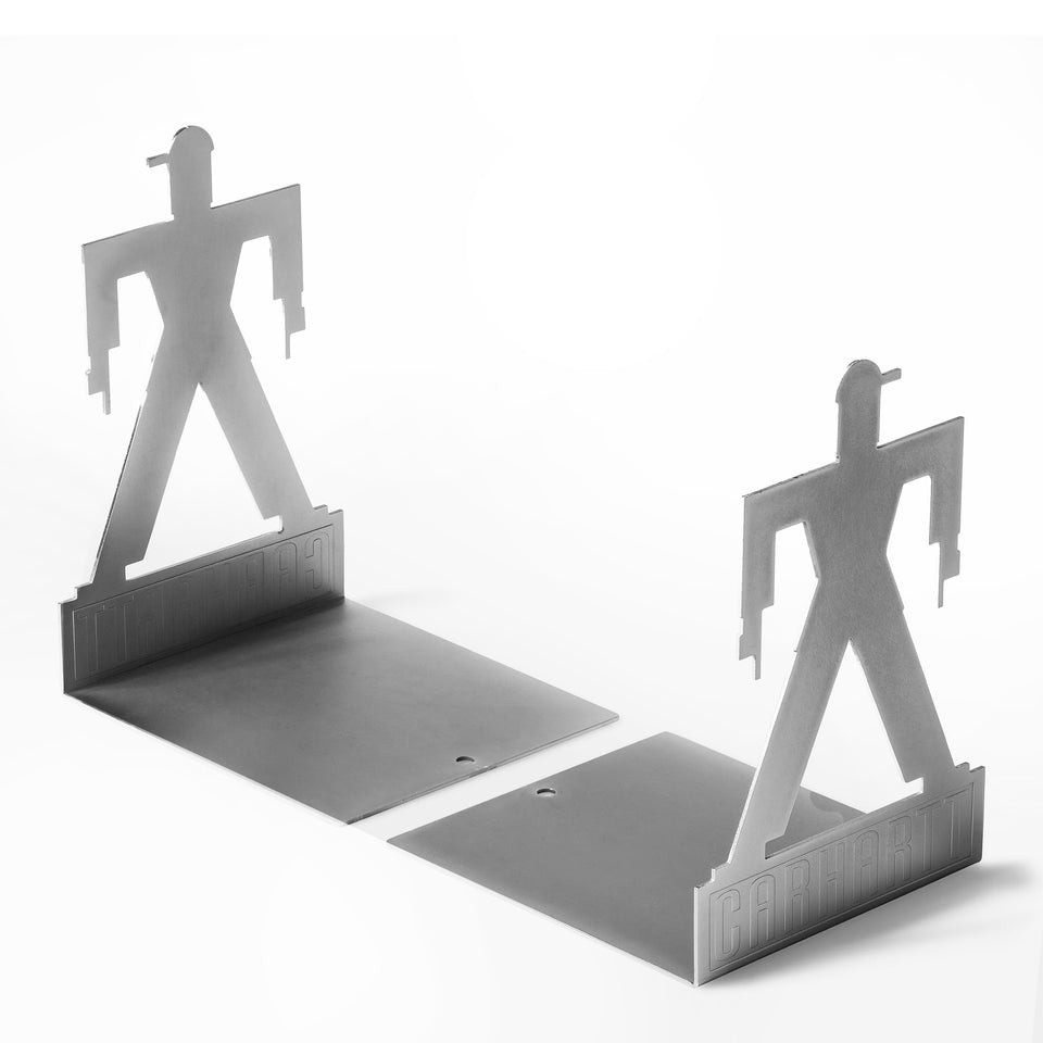 The Carhartt WIP Foundation Bookends in Silver are crafted from stainless steel with a sleek brushed finish. This set of two features subtle debossed branding and includes screws and dowels for secure installation. Both functional and stylish, these bookends are ideal for adding a modern industrial touch to your space while keeping books neatly in place.