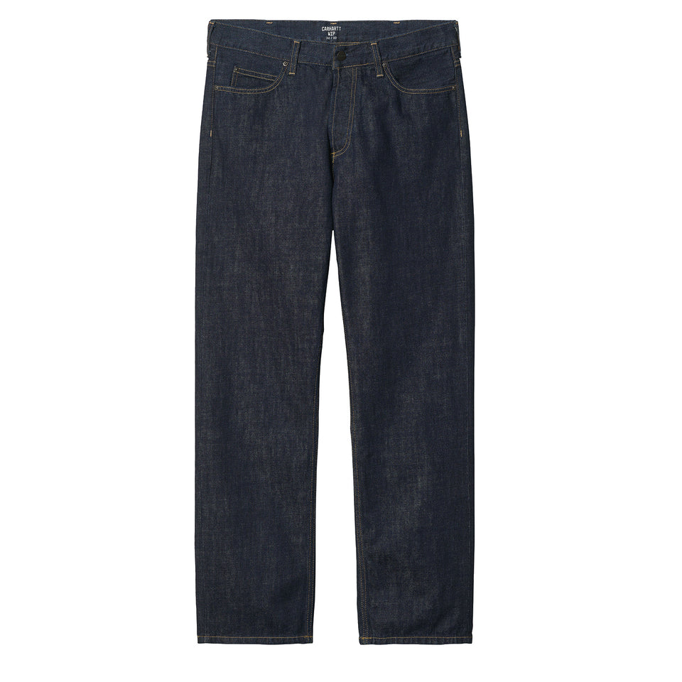 The Carhartt WIP Marlow Pant Blue Rinsed is made of Edgewood denim, which is a thick 12 oz fabric composed of cotton, and is cut in a relaxed, straight leg fit, featuring a slight taper below the knee. The style is detailed with a back yoke and buttoned fly, as well as two side and rear pockets.