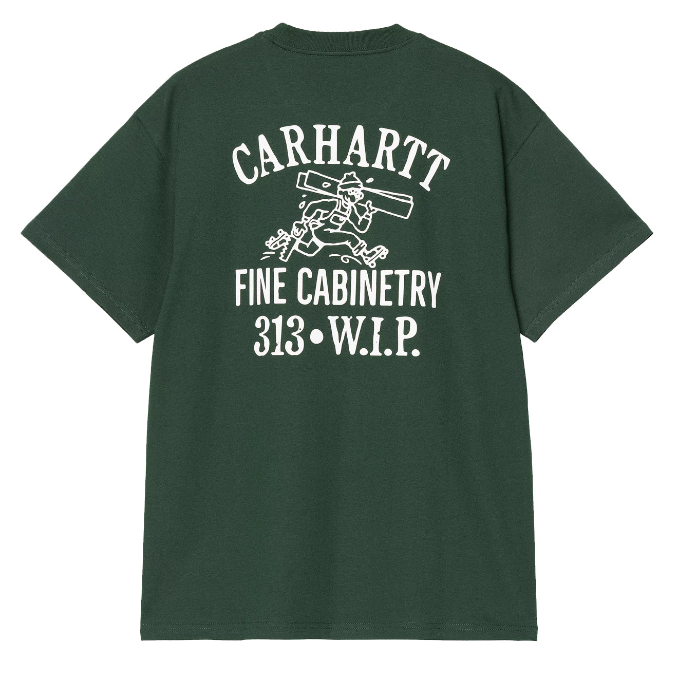 The Carhartt WIP S/S Cabinetry T-Shirt in Conifer / White is made from midweight cotton and cut in a loose fit, featuring bold graphic prints on the back, and a signature logo inspired print on the front.