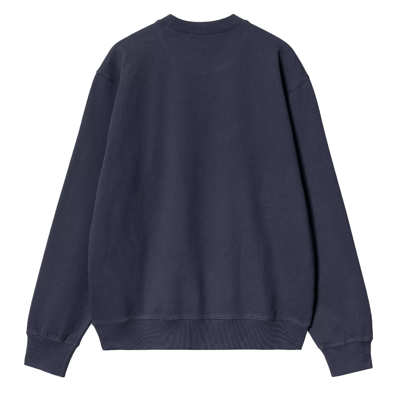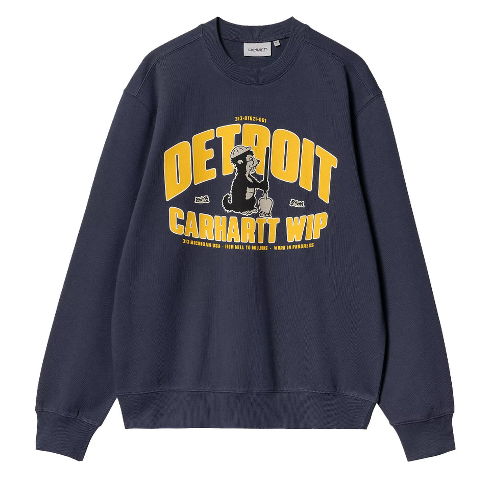 The Carhartt WIP Underground Sweat in Blue is designed for comfort and style, made from heavyweight, unbrushed cotton jersey featuring a tactile loopback construction. This sweatshirt is cut in a loose fit for a relaxed silhouette and is adorned with a striking graphic print on the front, making it a standout addition to any casual wardrobe.