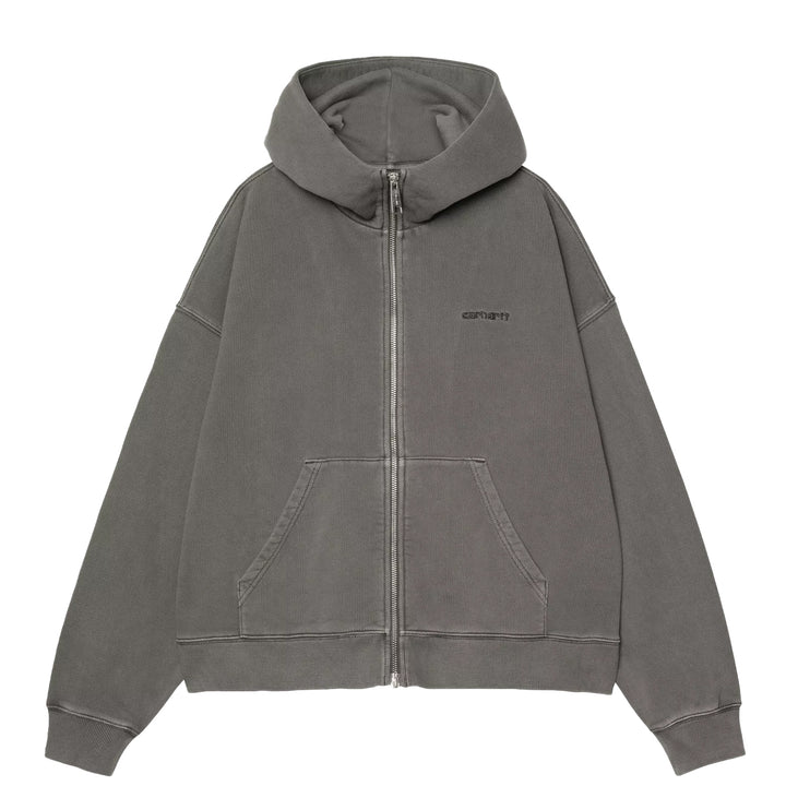 The Carhartt WIP Womens Hooded Benton Jacket in Graphite Garment Dyed is cut in a boxy loose fit from heavyweight cotton jersey with a loopback construction. Garment-dyed for a soft handfeel and rich tone, it features a front tonal Script Logo embroidery and a practical hooded design.