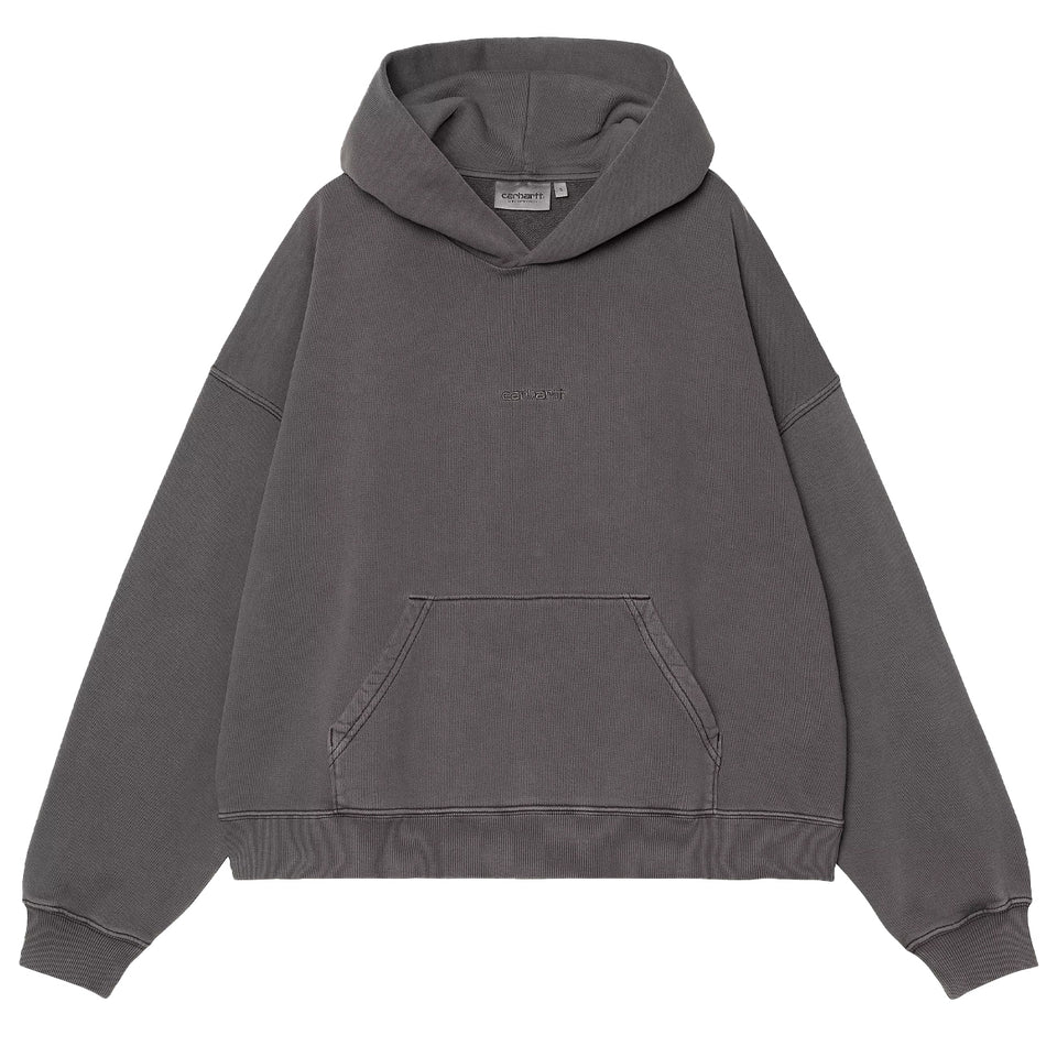 The Carhartt WIP Women's Hooded Benton Sweatshirt in Black Garment Dyed is crafted in a boxy loose fit from heavyweight, unbrushed cotton jersey with a tactile loopback construction. Garment-dyed for a softer feel and rich colour variation, this sweatshirt features an embroidered tonal Script Logo on the front, adding a subtle touch of style to this comfortable piece.
