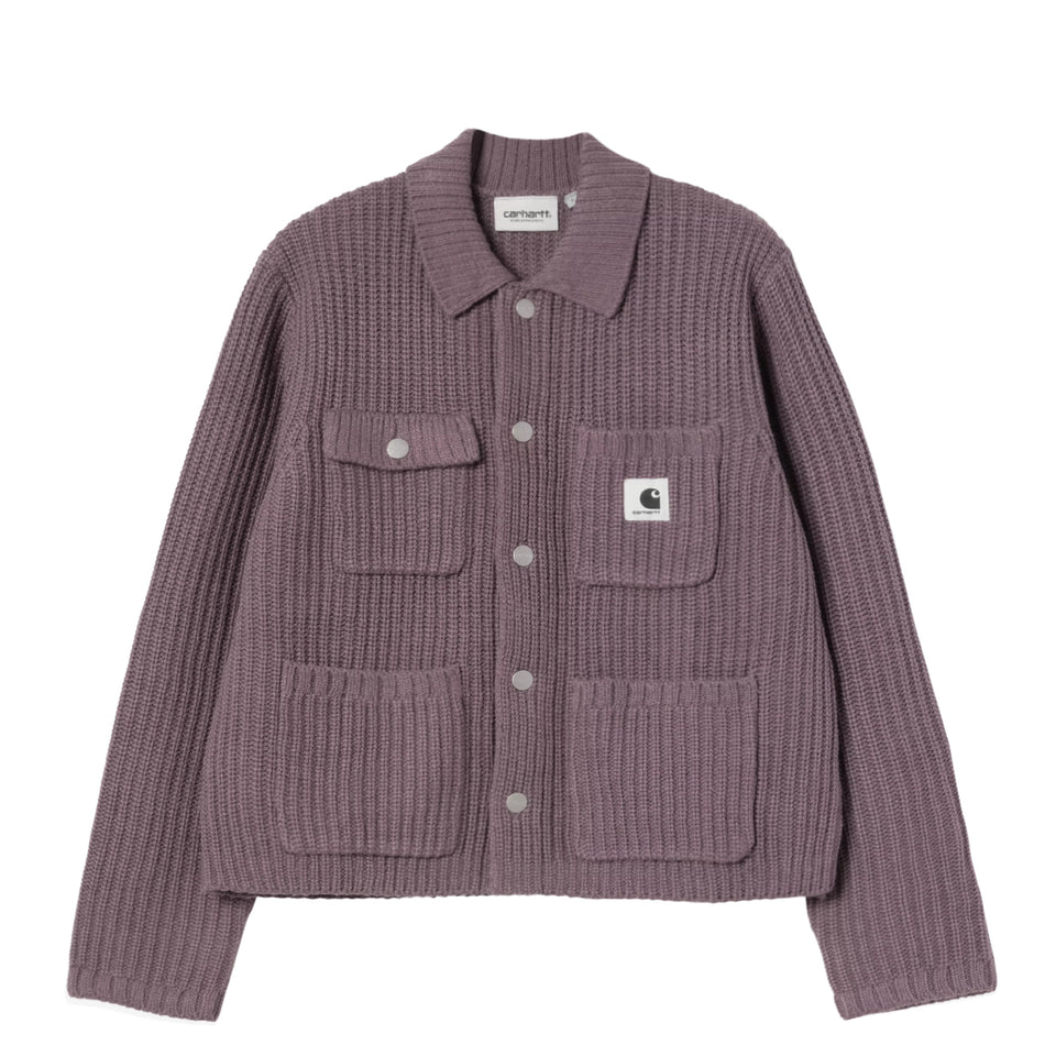 The Carhartt WIP Womens Michigan Sweater in Phlox is a soft, midweight knit designed for everyday comfort. Made from a blend of acrylic, wool, and nylon, it offers warmth with a slight stretch. The cardigan features a button-up front, long sleeves, and a collar, while the ribbed texture and chest logo patch bring a subtle, classic finish.