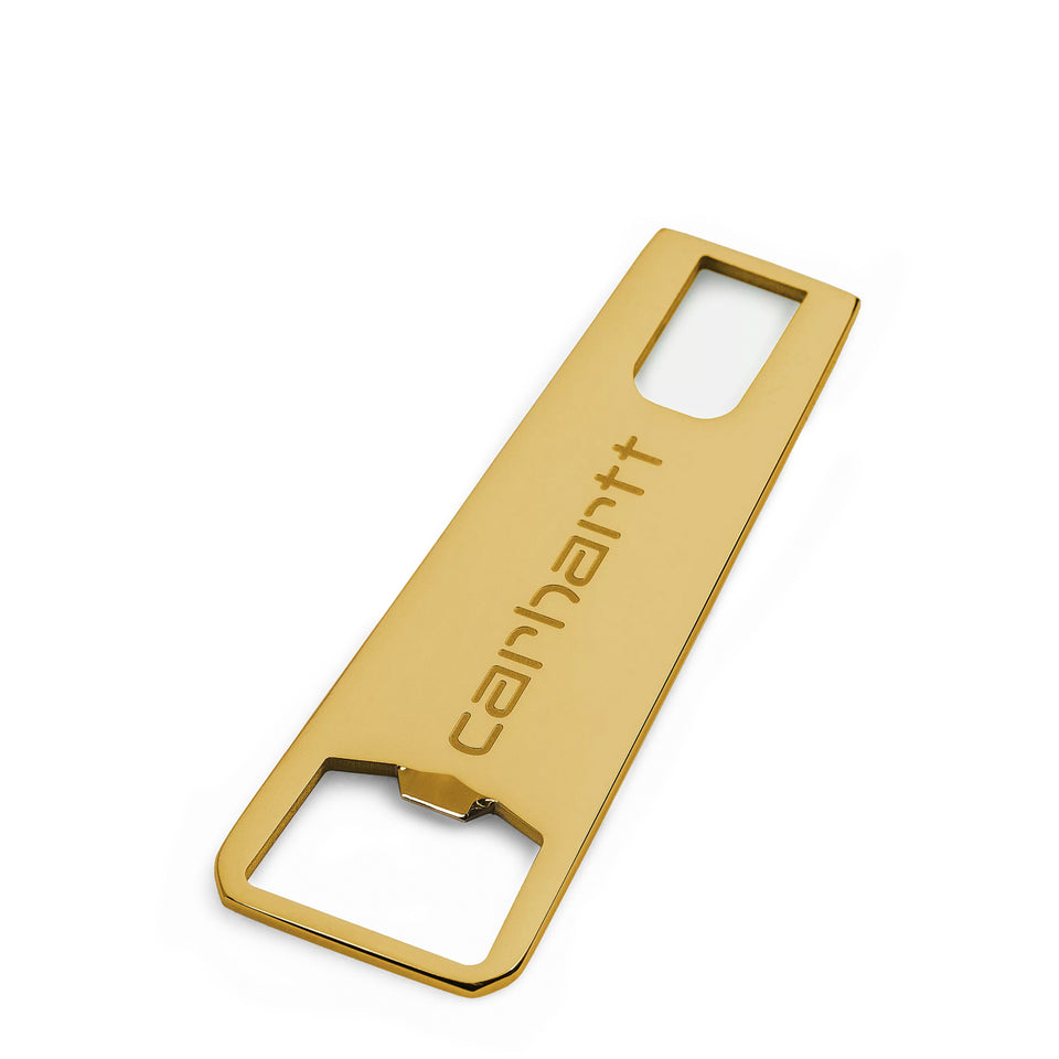 The Carhartt WIP Zip Bottle Opener in Gold is crafted from gold-plated stainless steel, designed in the shape of a classic Carhartt WIP zip pull. This stylish item includes two components: the opener itself and a wall mount for easy access. Both the front and back feature an engraved logo, adding a touch of sophistication to this practical accessory. Perfect for elevating your home bar or kitchen, it combines functionality with iconic design.