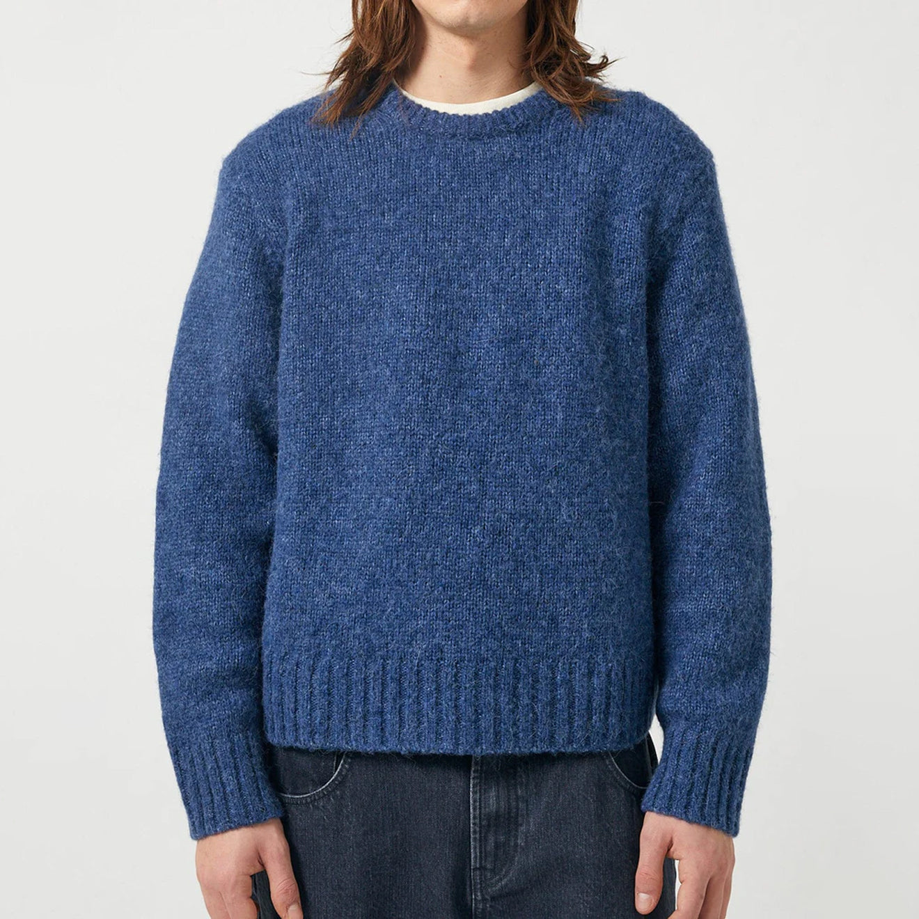 This sweater in indigo blue is knitted from a soft wool blend with alpaca for added comfort. This sweater in indigo blue has a tubular yarn construction that gives warmth without extra weight. This sweater in indigo blue is cut for a regular fit that works well for layering.