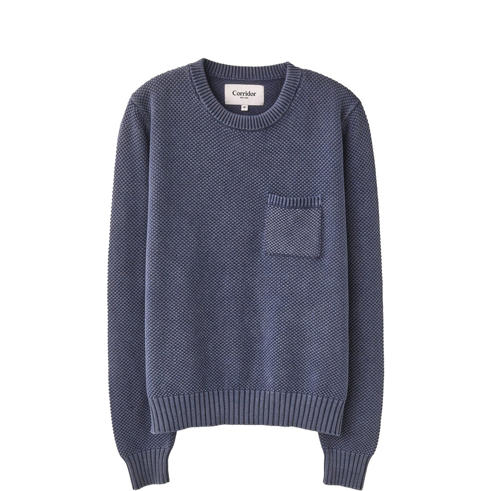 The Corridor Pocket Crewneck in Navy is made from 100% cotton with a rice stitch knit and a vintage wash for a soft, worn-in feel. It features a single chest pocket, combining casual comfort with subtle detailing for everyday wear.