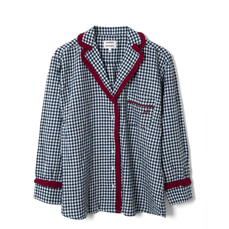 The Damson Madder Antonia Pyjama Set in Navy Gingham brings a cosy update to a classic favourite. Crafted from 100% organic cotton, this two-piece set features contrast burgundy trims and an easy fit for relaxed comfort.