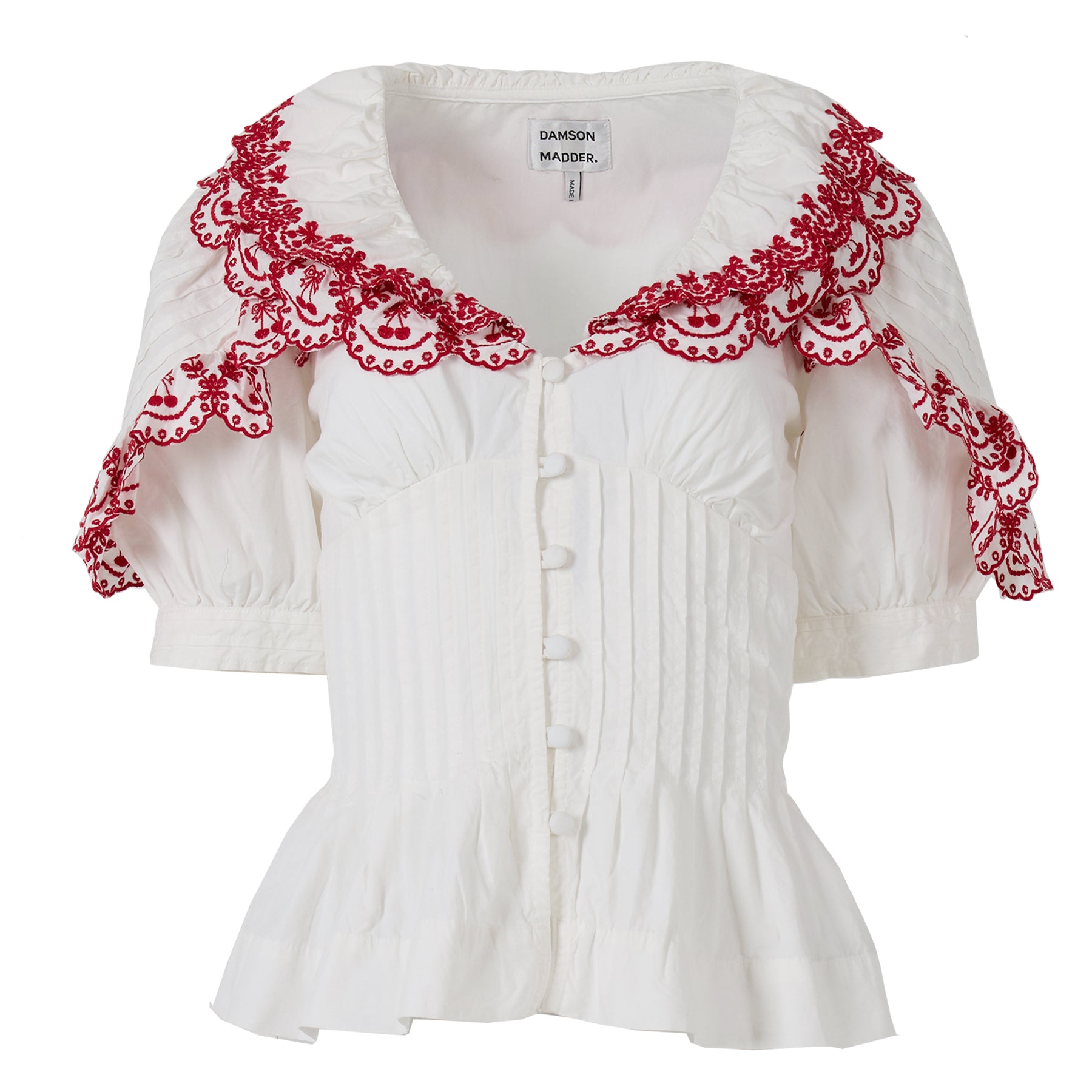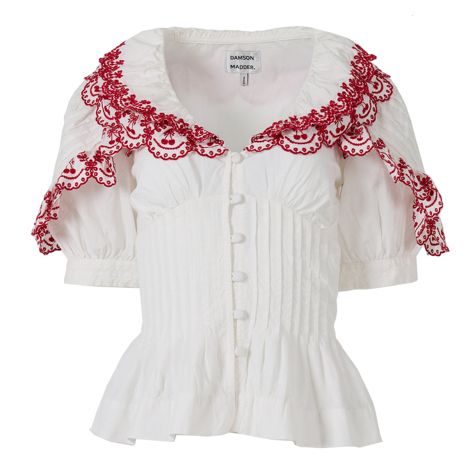 The Damson Madder Caroline Blouse combines tailored elegance with feminine charm. Featuring delicate cherry embroidery, a pin-tuck bodice, puff sleeves, and a small peplum hem, this cotton blouse is perfect for summer styling. Pair it with the matching Jenna Bloomer Shorts for a playful, coordinated look that captures the essence of effortless summer fashion.