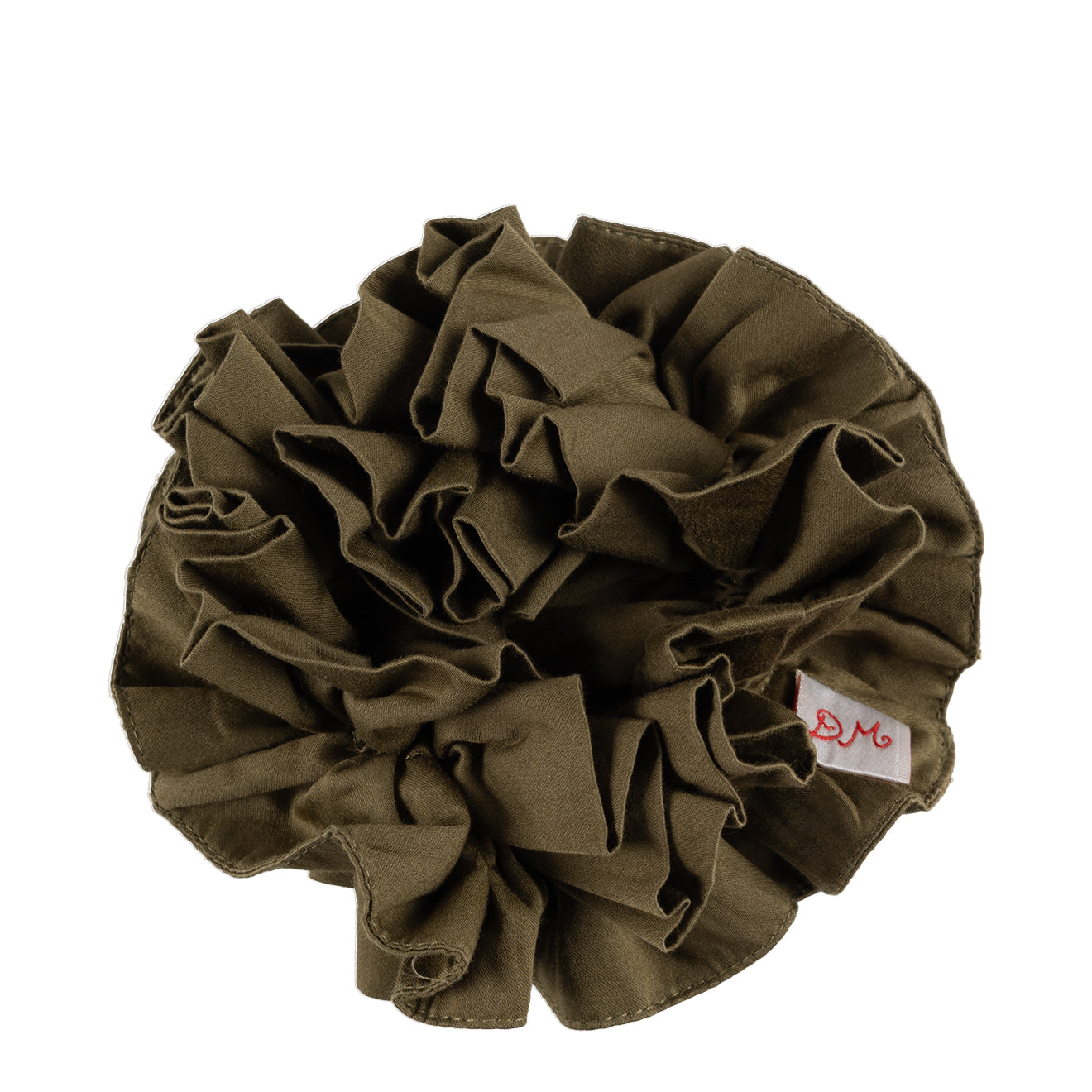 The Damson Madder Garter Scrunchie Olive Jacquard Satin is made from 100% organic cotton with a shirred garter design for a comfortable, stylish hold.