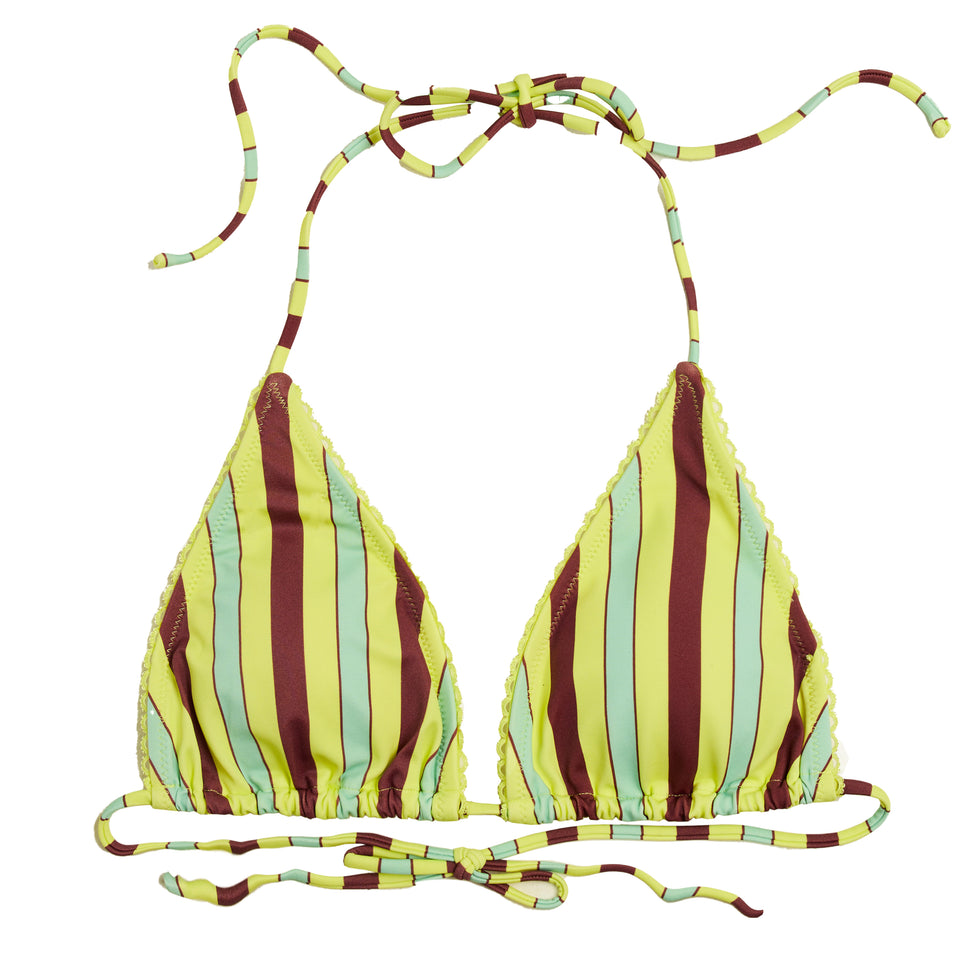 The Damson Madder Picot Trim Triangle Bikini Tropical Stripe is designed to upgrade your holiday wardrobe with vibrant colour and flattering shape. Featuring removable padded cups for versatile support, along with adjustable neck and back ties, this bikini top perfectly blends comfort and style.