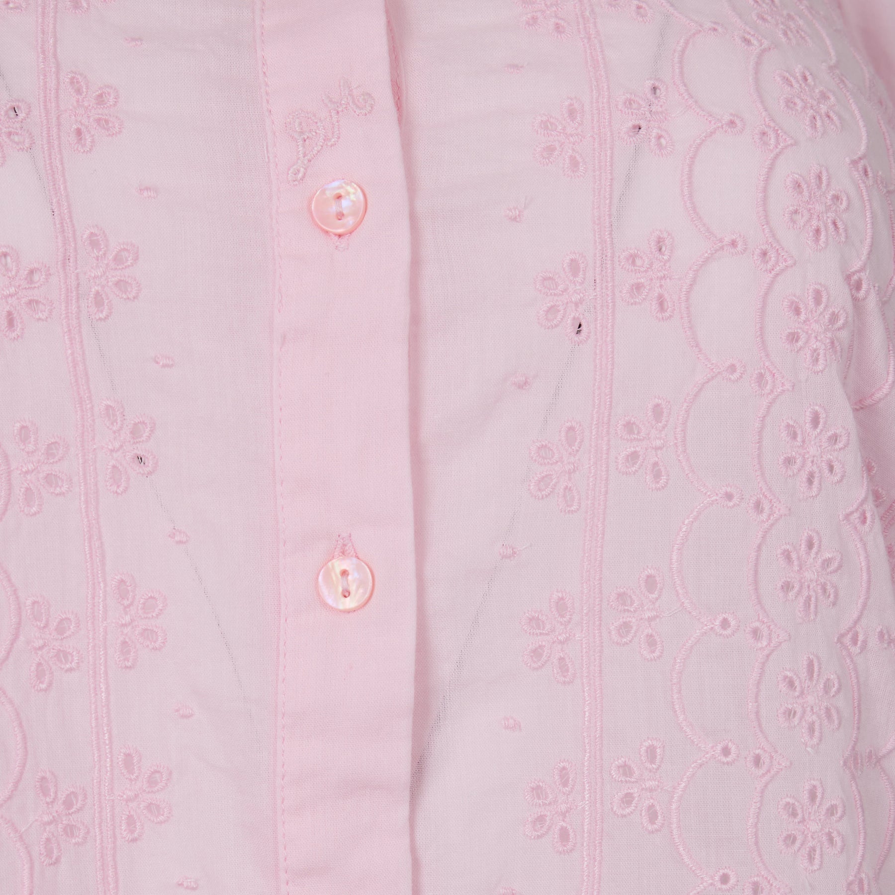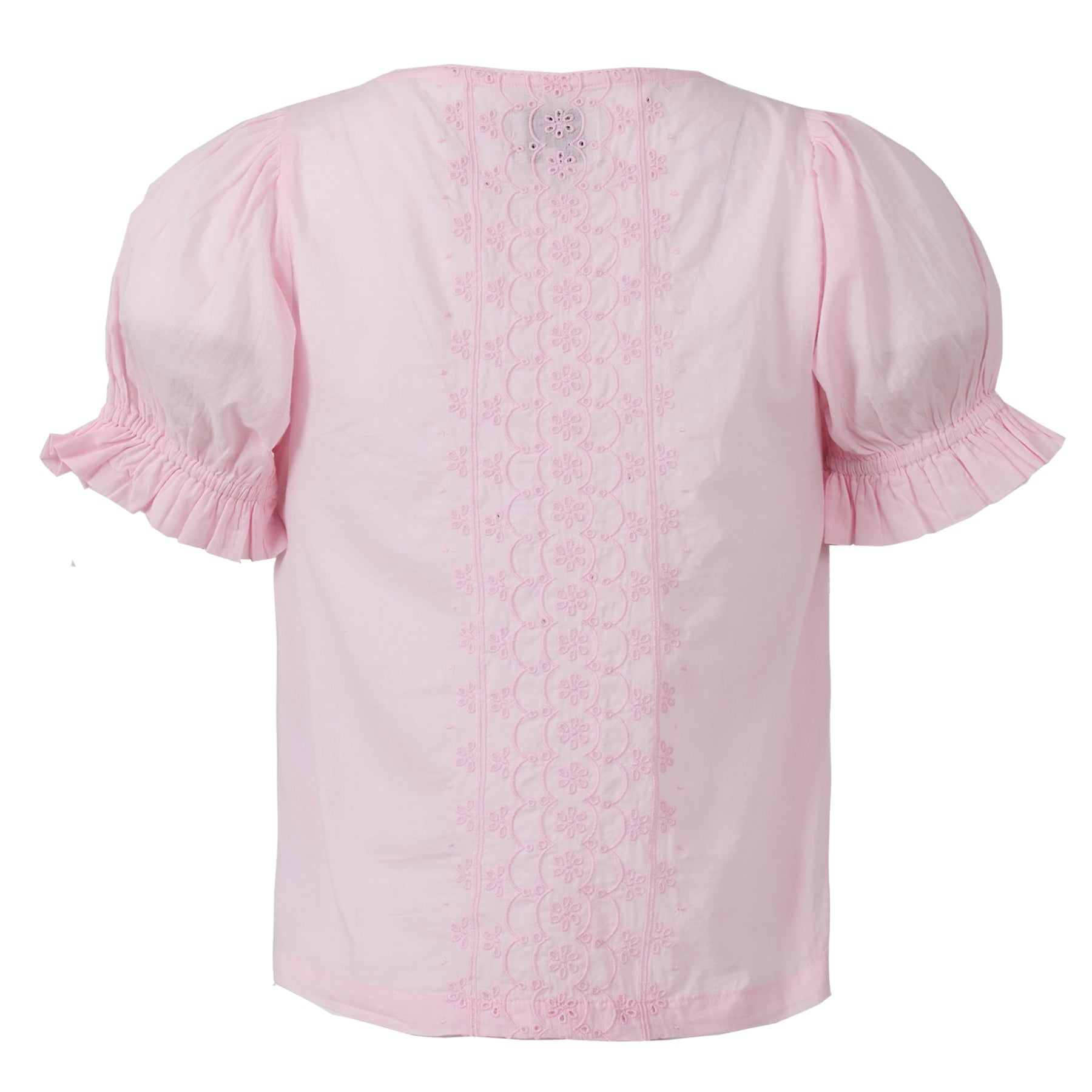 The Damson Madder Prim Blouse in Pink is made from soft cotton and features beautiful broderie anglaise detailing. With a scallop-trimmed scoop neck, puffed sleeves, elasticated cuffs with ruffled trims, and a longer back hem, this blouse offers a feminine and elegant look.