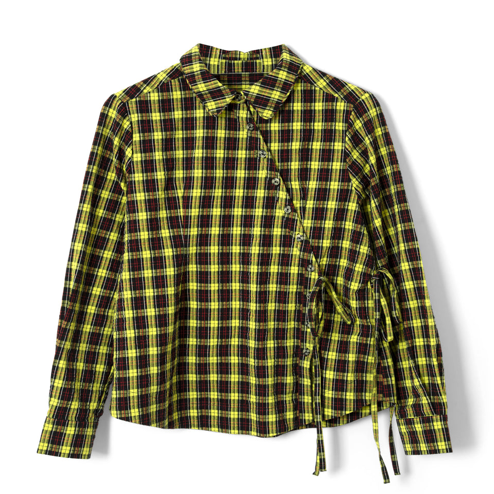 The Damson Madder Robyn Shirt in Yellow Check is crafted from textured 100% organic cotton, featuring a bold check print and an asymmetric button placket. Its distinctive design is elevated with a removable neck tie for versatile styling.