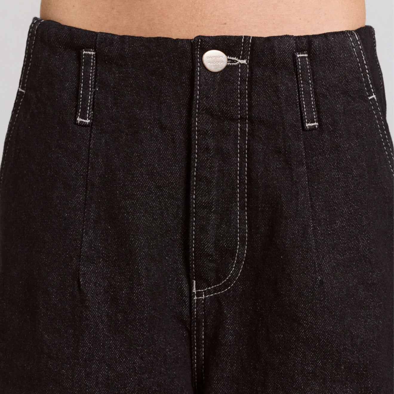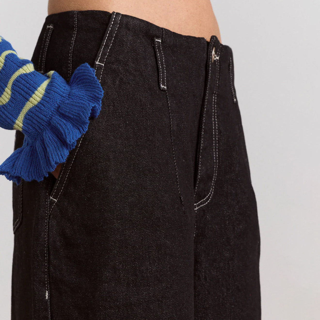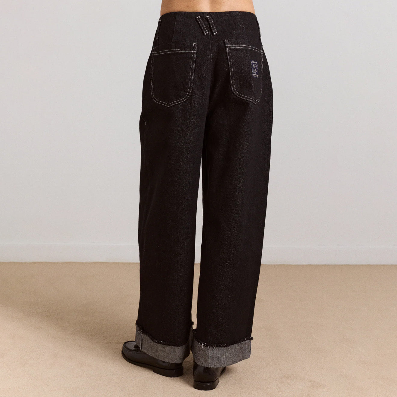 The Damson Madder Womens Loose Fit Pascal Jeans in Black Wash are designed with a relaxed silhouette and straight leg shape. Crafted from organic and recycled cotton denim, they are finished with contrast stitching and distinctive branding details.