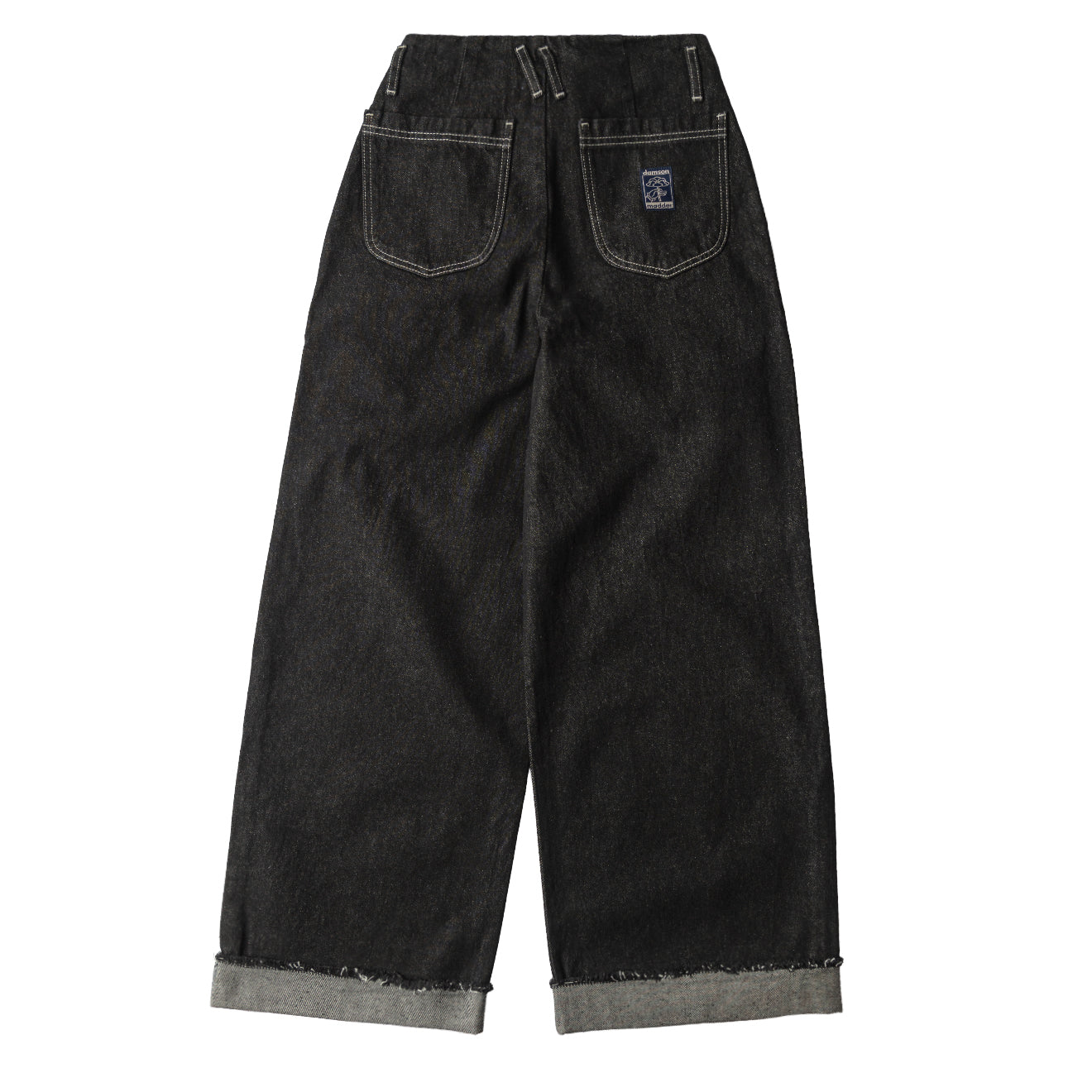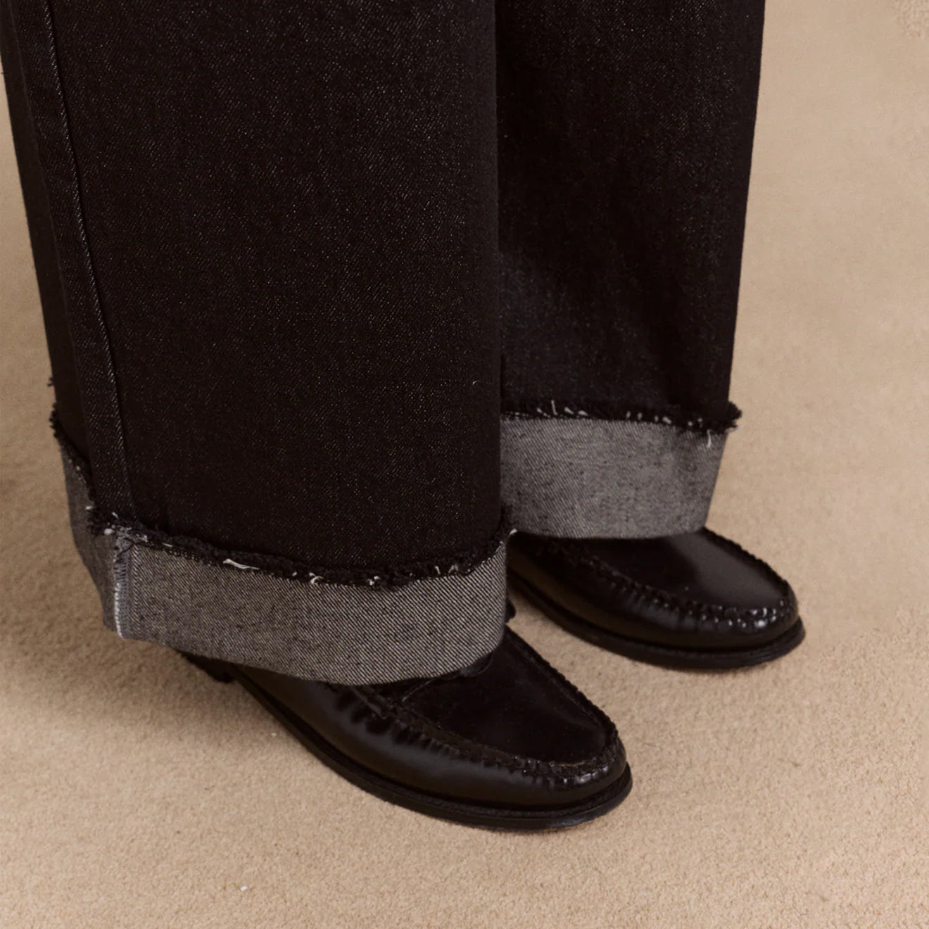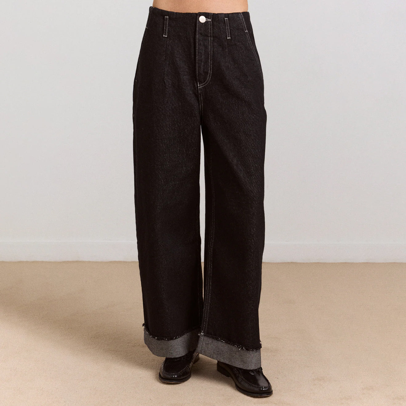The Damson Madder Womens Loose Fit Pascal Jeans in Black Wash are designed with a relaxed silhouette and straight leg shape. Crafted from organic and recycled cotton denim, they are finished with contrast stitching and distinctive branding details.