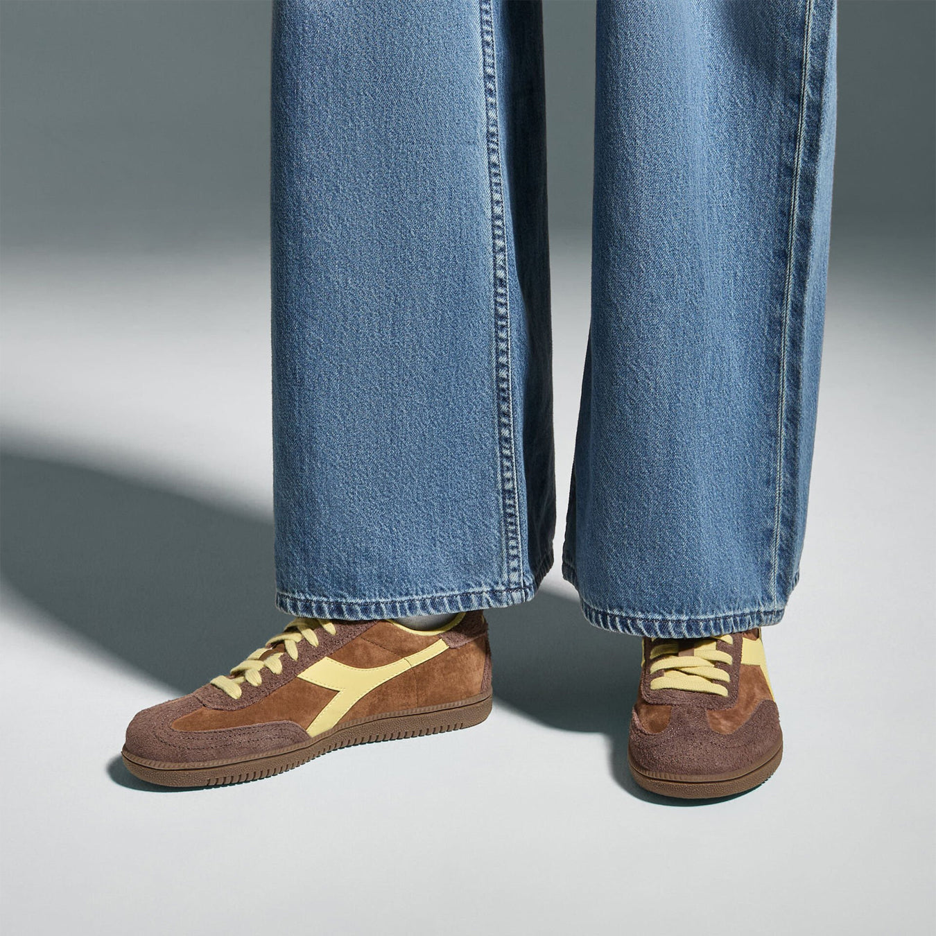 The Women's Diadora Hairy Trainer in Brown Gianduia is a heritage-inspired sneaker crafted from soft pigskin leather with bold cow hairy suede details. Its design celebrates the 1980s terrace style while offering modern comfort and durability.