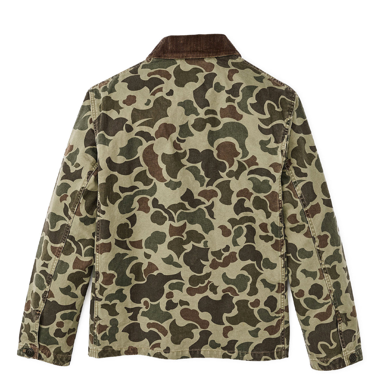 The Filson Canvas Outfitter Jacket in Tundra Shrub Camo is built for durability and everyday utility. Crafted from tough 10.5-oz cotton canvas, it offers superior resistance to wind, thorns, and abrasions. Inspired by vintage field coats, it features dual-purpose hand and cargo pockets, a button-front closure, and adjustable cuffs. A corduroy-lined collar adds comfort and classic outdoor style, while the flannel lining enhances warmth and wearability.