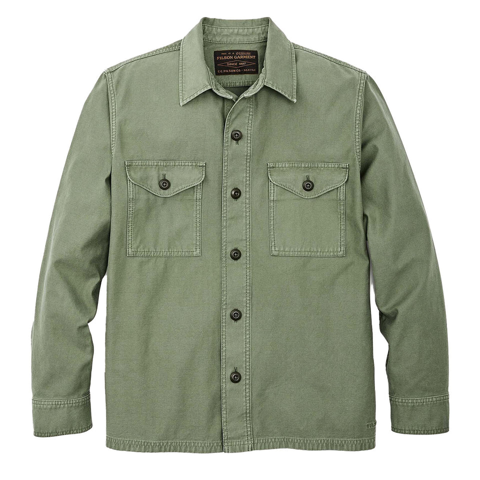 The Filson Field Jac-Shirt in Washed Fatigue Green is a versatile overshirt providing an added layer of protection on cool days in the field. Patterned after the original iconic Jac-Shirt that’s been a favorite since the 1970s, its versatility makes a sure go-to favorite. The strong midweight fabric is a reverse-sateen weave, smooth on the inside for easy layering. Sturdy buttons secure the front, chest-pocket flaps, and adjustable cuffs. Straight hem for untucked wear.
