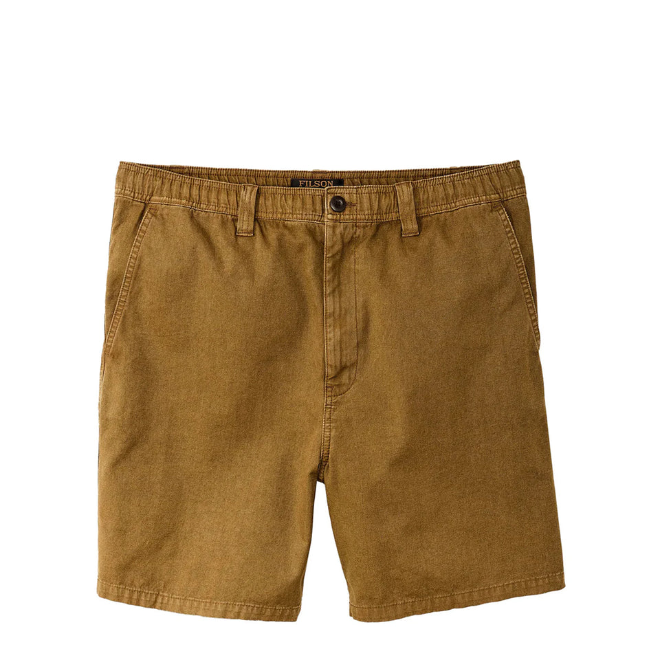 The Filson Oakville Canvas Shorts in Bronze Brown are ideal for summer hikes and outdoor adventures. Crafted from durable yet lightweight 8-ounce cotton canvas, these shorts provide breathable comfort in warm weather. The hidden elastic and drawcord waistband allow for belt-free wear and a secure fit, perfect for spontaneous swims. Designed with easy-access slash front pockets and button-secure back patch pockets, these shorts offer practical storage and rugged style for any active lifestyle.
