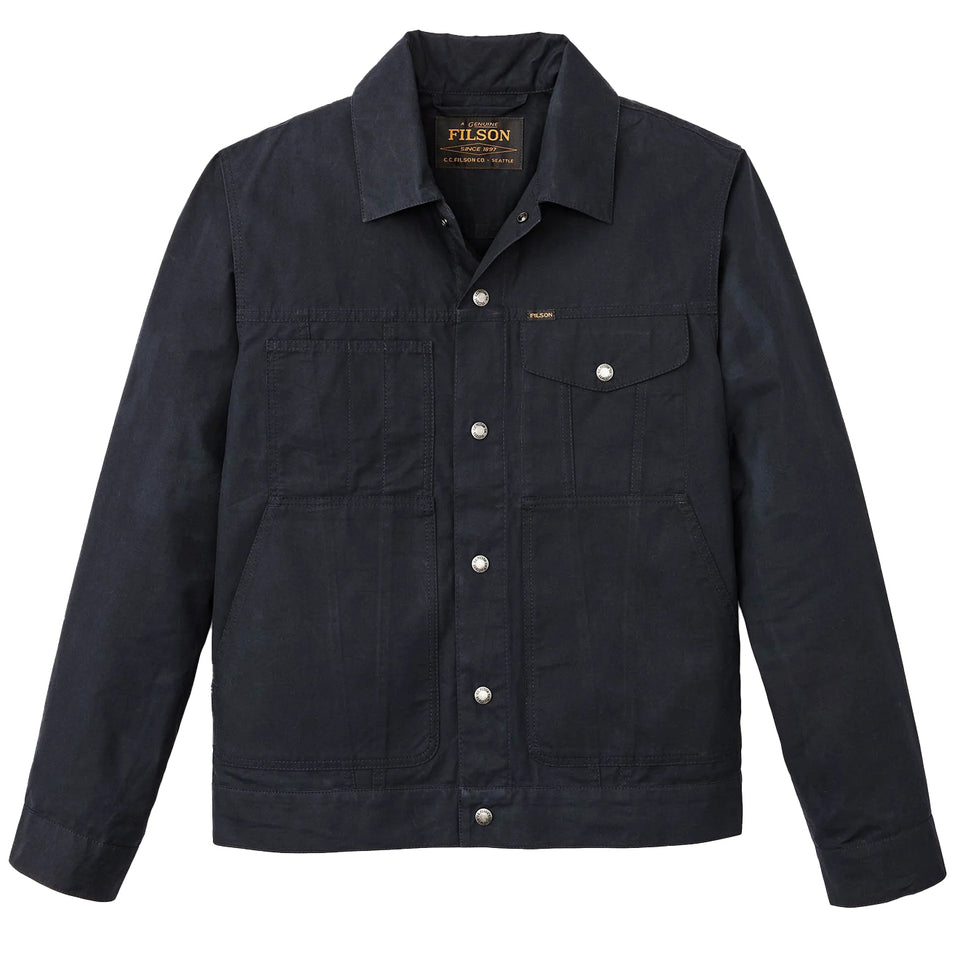 The Ranger Short Cruiser in Navy is made with the signature waxed-cotton and 7-oz. dry-waxed fabric from British Millerain, providing superior quality and durability. With a relaxed fit and unlined design, this jacket is perfect for warmer weather and repels wind and rain. The dry-wax finish makes for easy care and the hip-length cut allows for convenient access to pockets or tools. Durable metal snaps secure the front, cuffs, and hem adjustments, while the chest pocket is flap-covered and the right is slotted for smaller items. Reinforced hand pockets ensure strength for all your outdoor adventures.