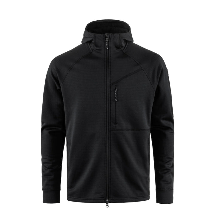 The Fjällräven Abisko Grid Fleece Hoodie in Black is a warm, hooded fleece with a knitted outer layer and lofted grid-structured inner for enhanced insulation. Made from recycled polyester, it is fast-drying and moisture-wicking, ideal as a mid-layer under a shell or on its own in cooler weather. Featuring a snug hood and full-length two-way zipper, it is versatile, packable, and perfect for hikes and outdoor activities.