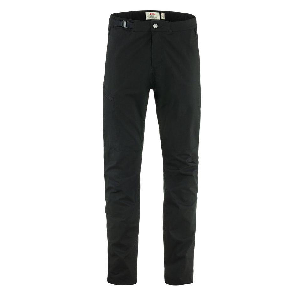 The Fjallraven Abisko Hike Trousers M are made from G-1000 Air Stretch with recycled polyester and organic cotton. They have a tapered fit, integrated belt for adjusting the waist, and ventilation openings on the sides – for warm-weather trekking optimisation. Two zippered hand pockets, zippered pocket on the right leg, and leg endings with drawcord adjustments.