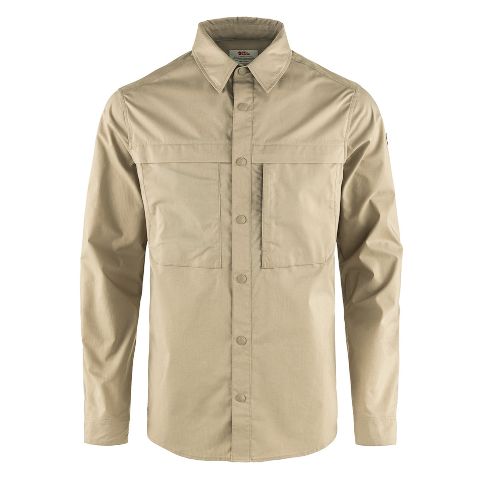 Fjallraven Abisko Trail Shirt LS in Fossil. Long-sleeved shirt for men with a relaxed fit featuring a number of functional details for multifaceted outdoor life. Made of G-1000 Air Stretch for well-ventilated comfort and fantastic freedom of movement. Abisko Trail Shirt LS M has press buttons down the front, a ventilation opening with mesh at the back and cuffs with gussets and press buttons. The collar can be turned up and secured in place and also has an extra panel providing additional sun protection for your neck on sunny days.