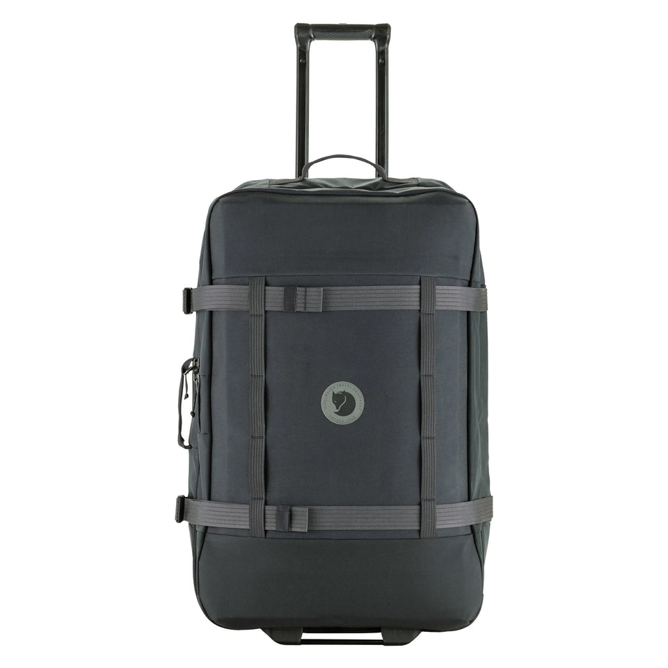The Fjällräven Färden Roller 120 in Coal Black is a spacious travel bag designed for longer trips. Built with a stable internal chassis and smooth-rolling wheels, it handles uneven ground with ease. The bag divides in the middle for easy organization and includes mesh pockets, internal and external compression straps, and light padding on the front to protect contents.
