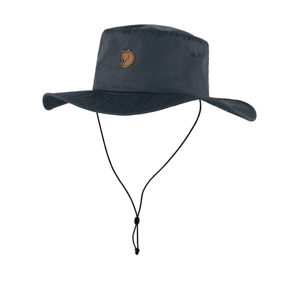 Wide-brimmed sun hat in quick-drying, cool G-1000® fabric. Leather Fjällräven logo on the forehead. Drawcord adjustment under the chin holds the hat in place when the wind picks up.